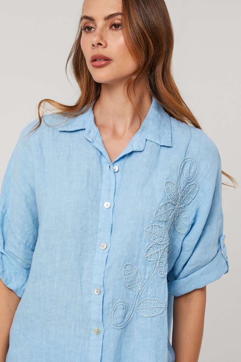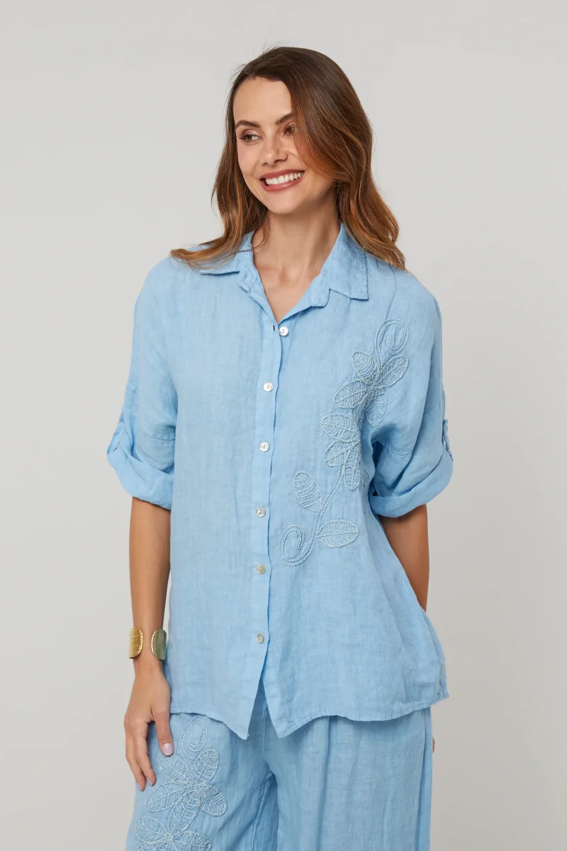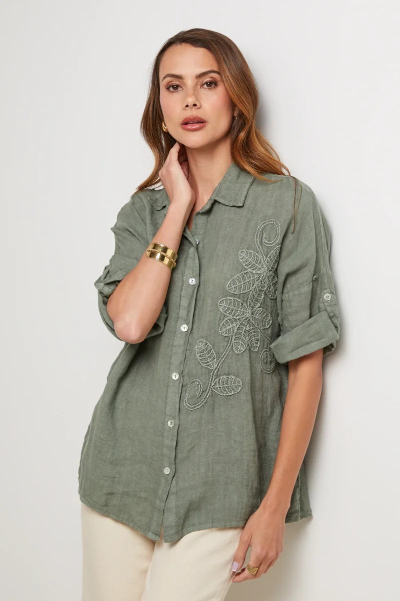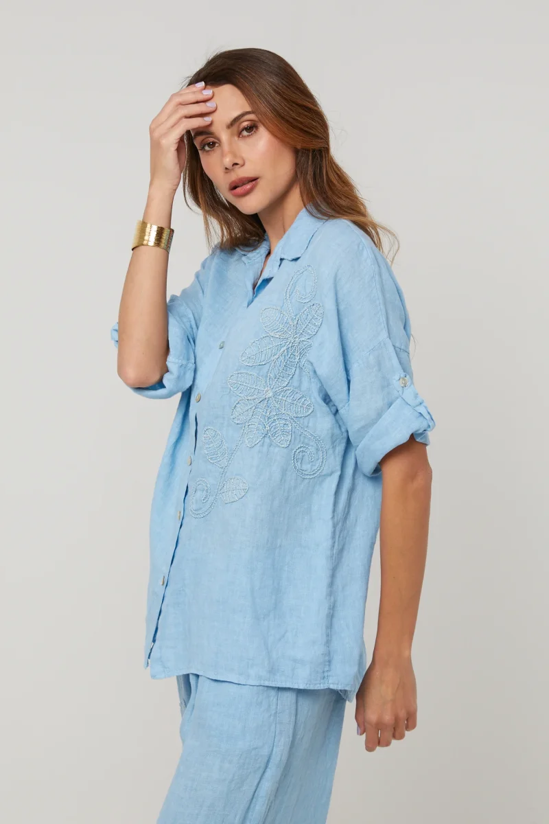 Chemise en lin, manches 3/4 avec broderie fleur Composition : 100% LINOrigine : ItalieEntretien : Lavage en machine, en dessous de 30 ° C