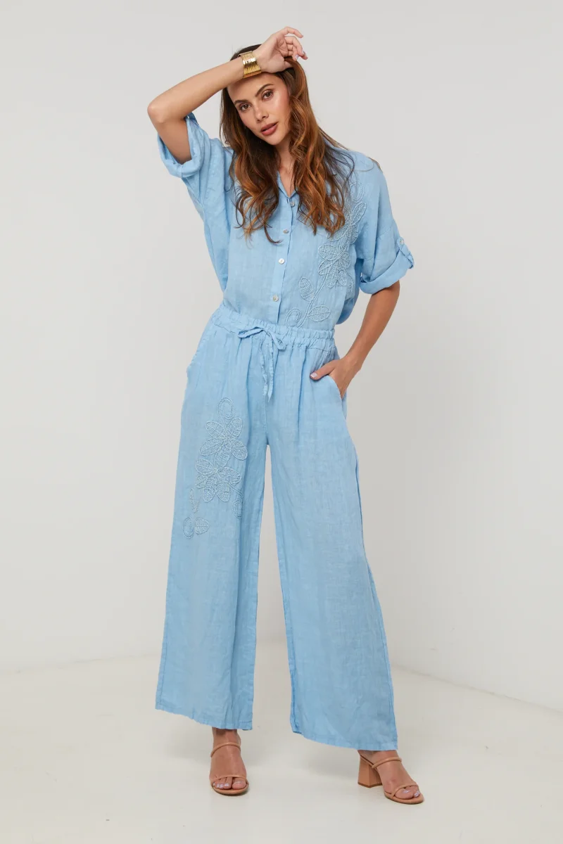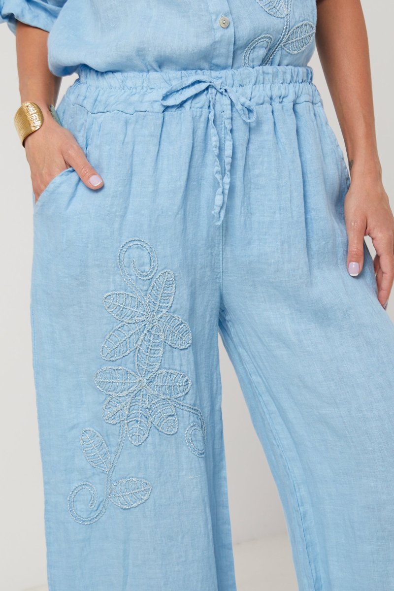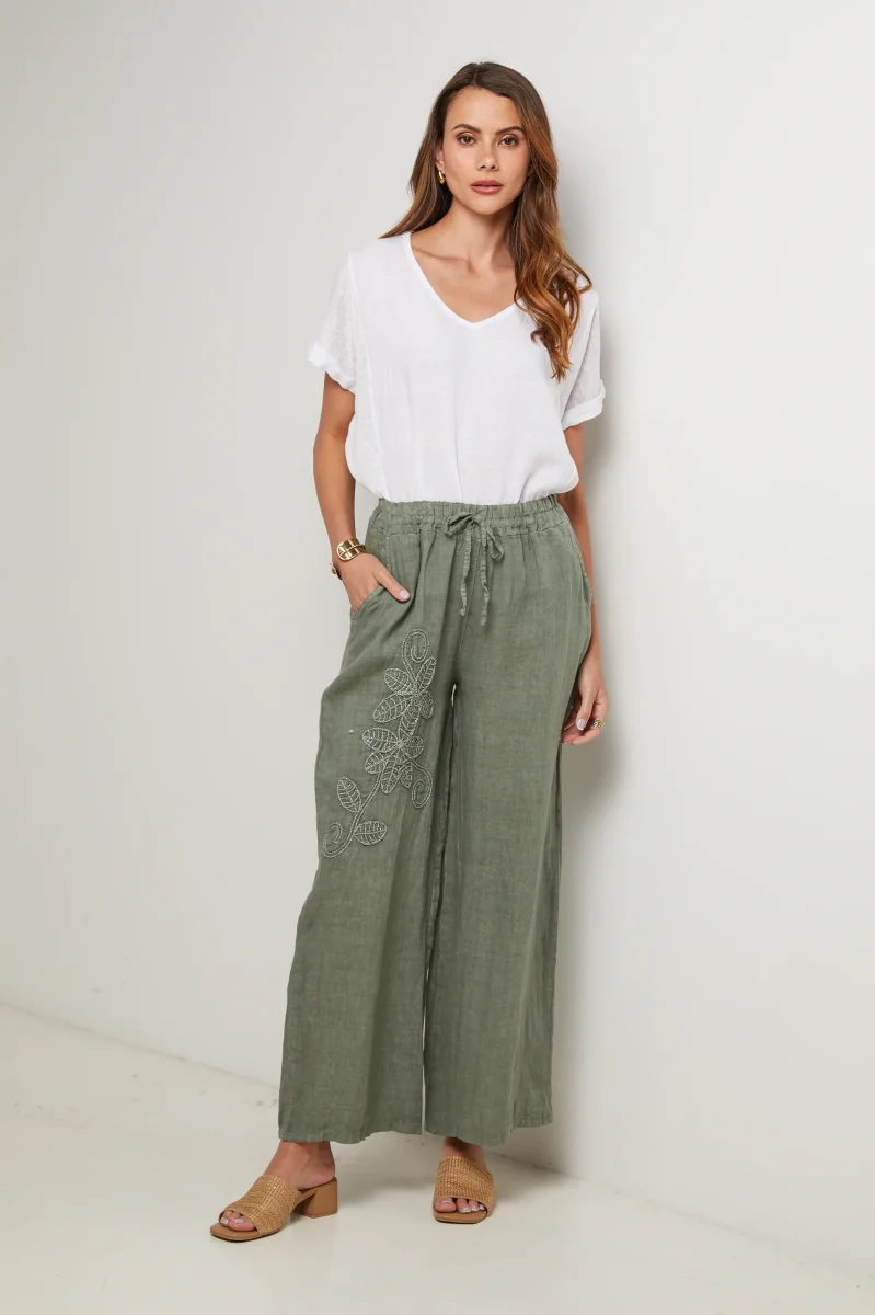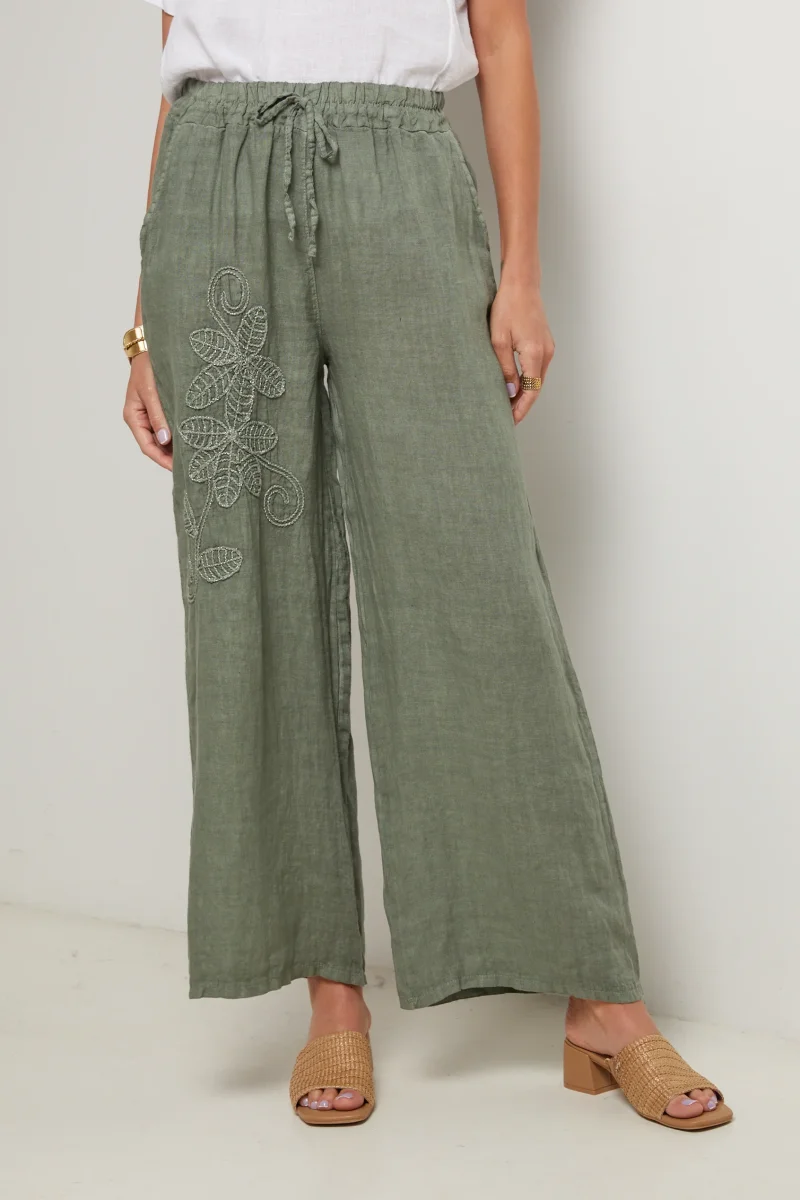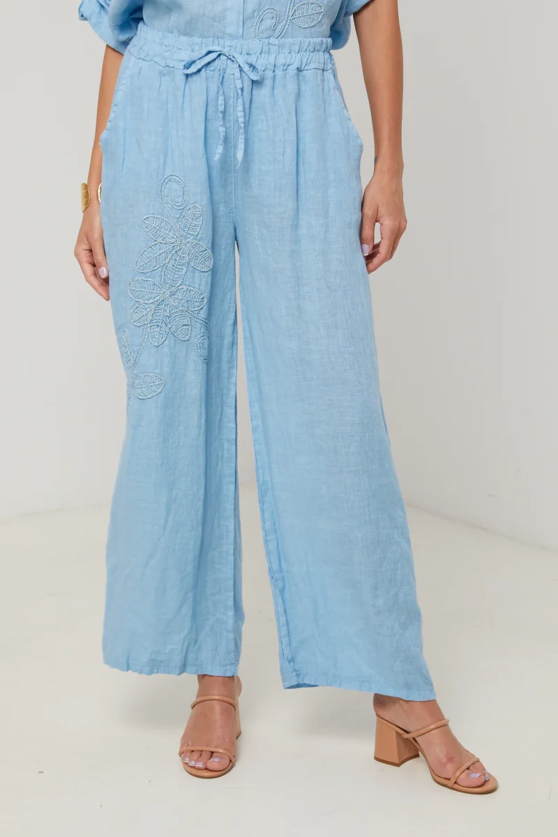 Panatalon large, avec attache au niveau de la taille, détail broderie fleur Composition : 100% LINOrigine : ItalieEntretien : Lavage en machine, en dessous de 30 ° C
