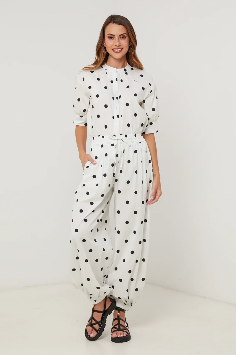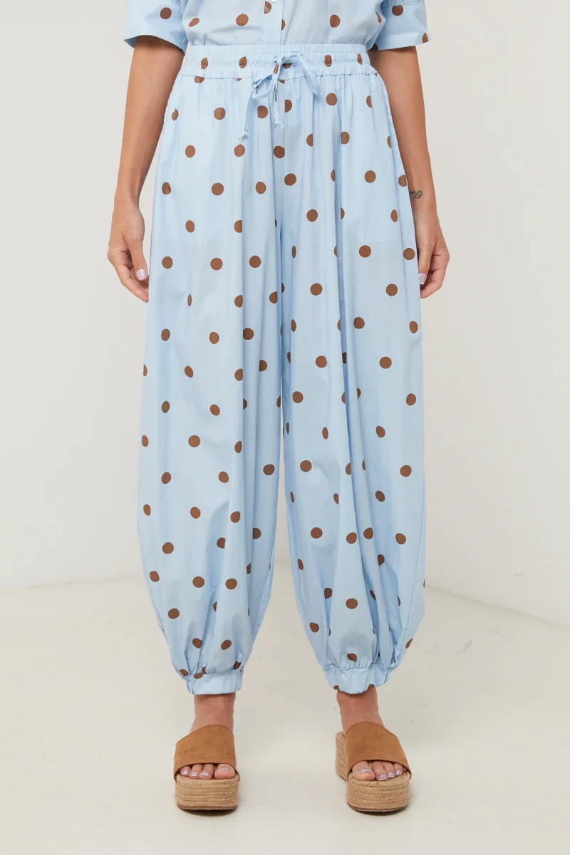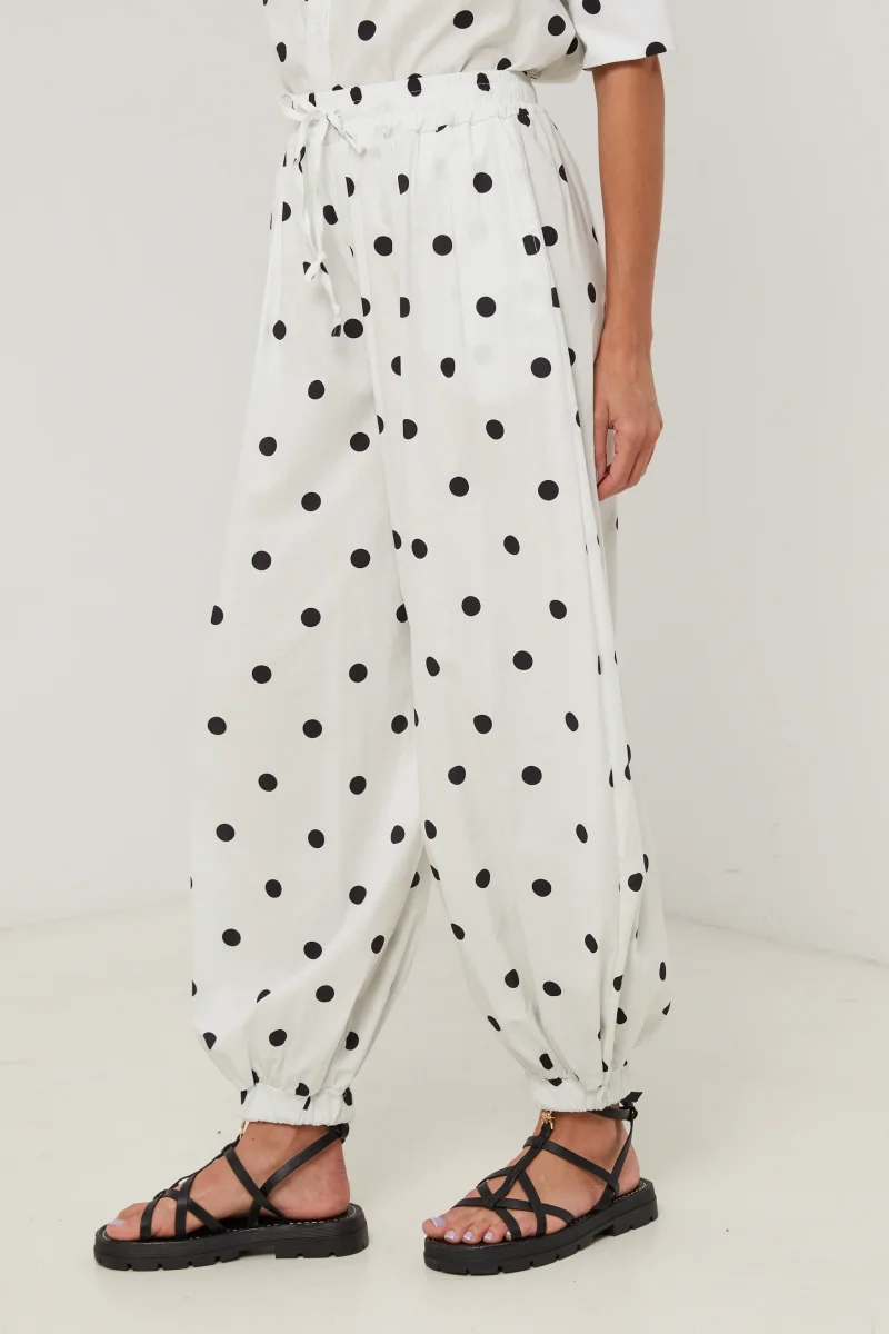 Pantalon en coton cintré au niveau des chevilles, attache au niveau de la taille, poches latérales, motif à pois