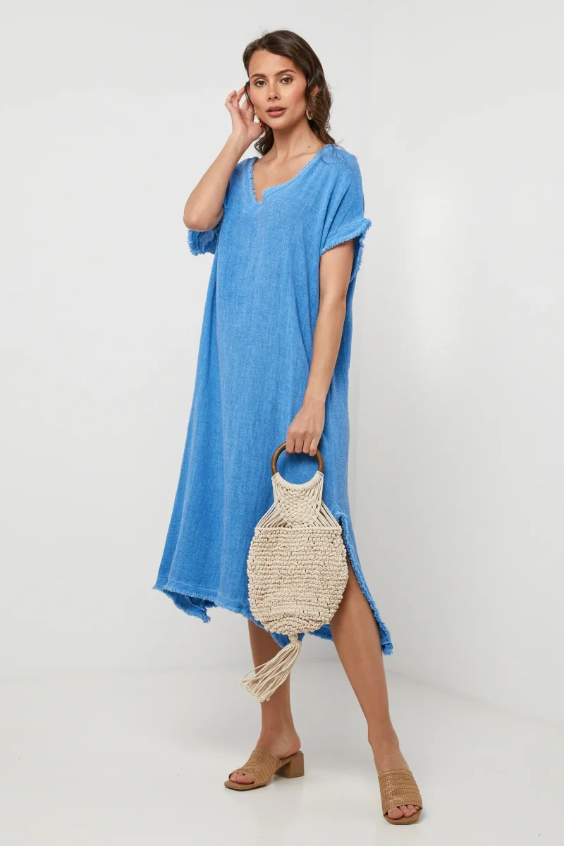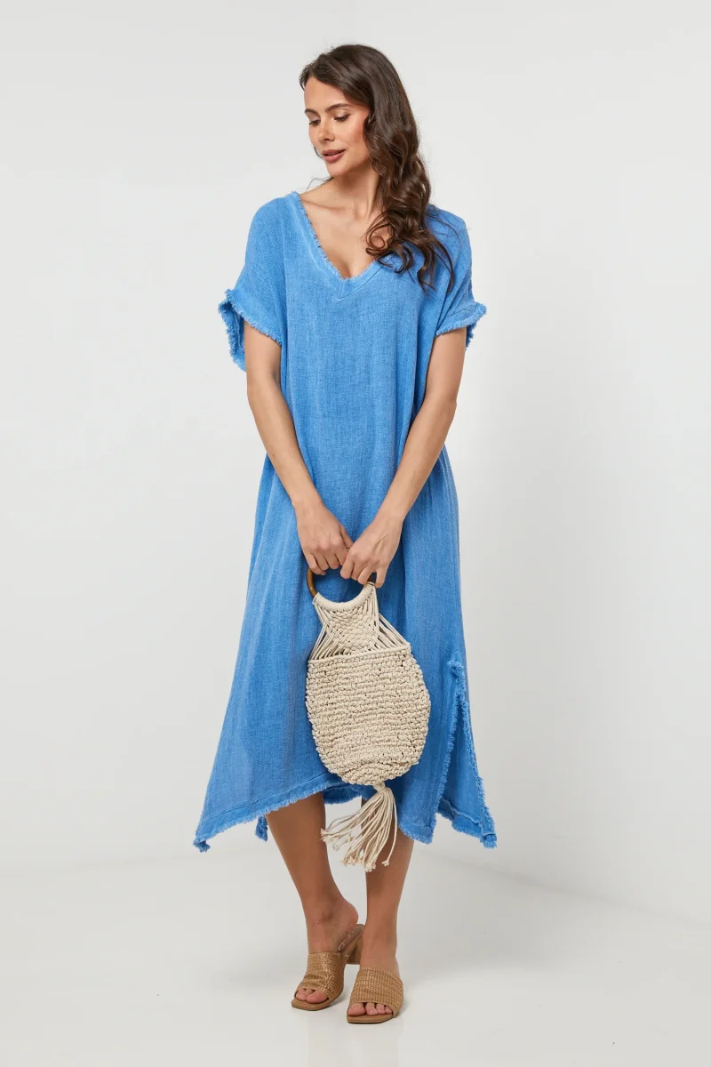 Robe longue loose à manches courtes, col V à détail effiléLavage en machine, en dessous de 30 ° C50% Lin 50% Coton