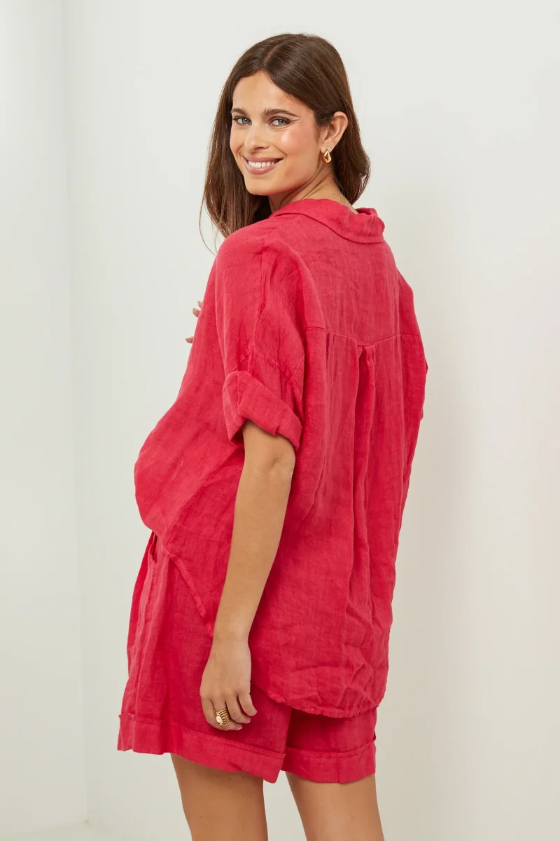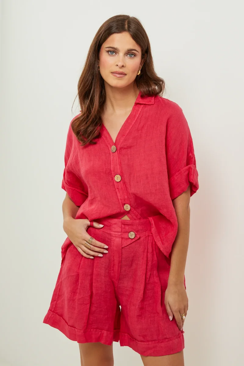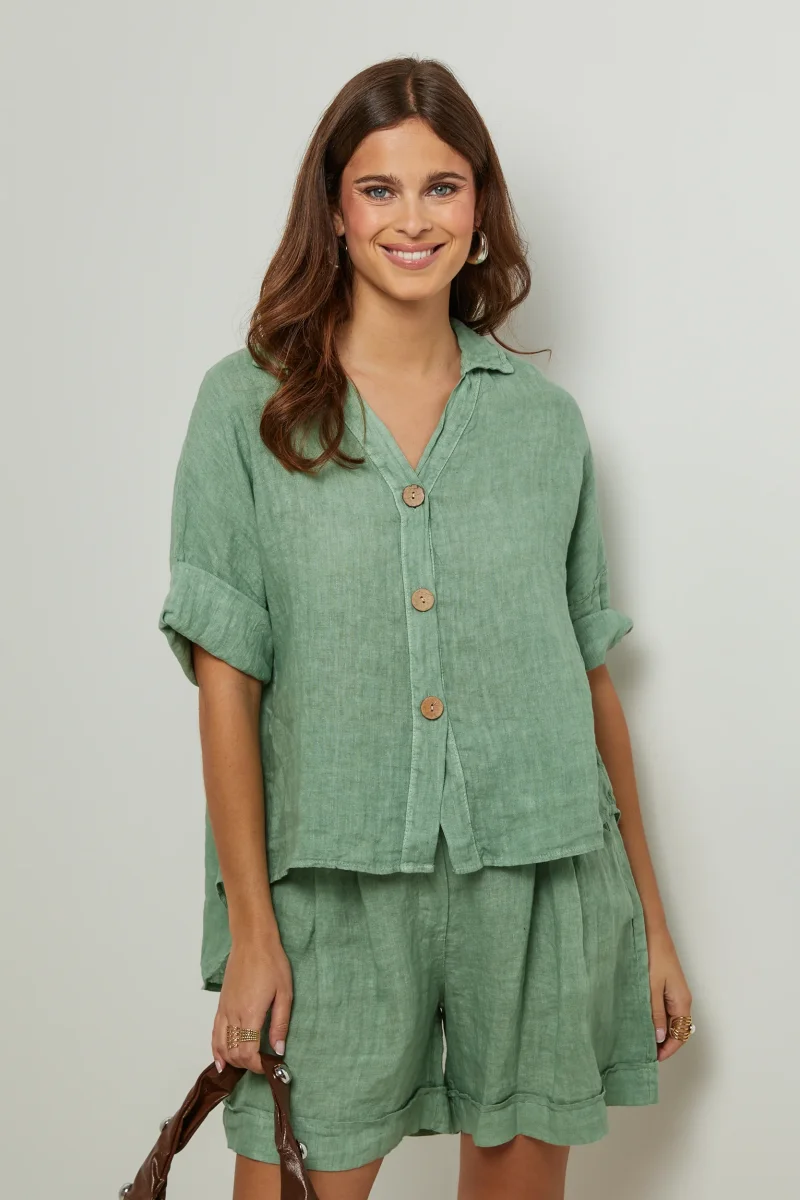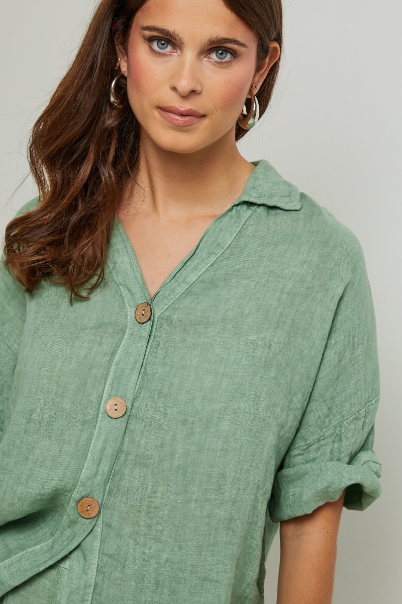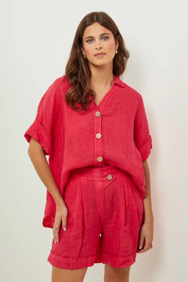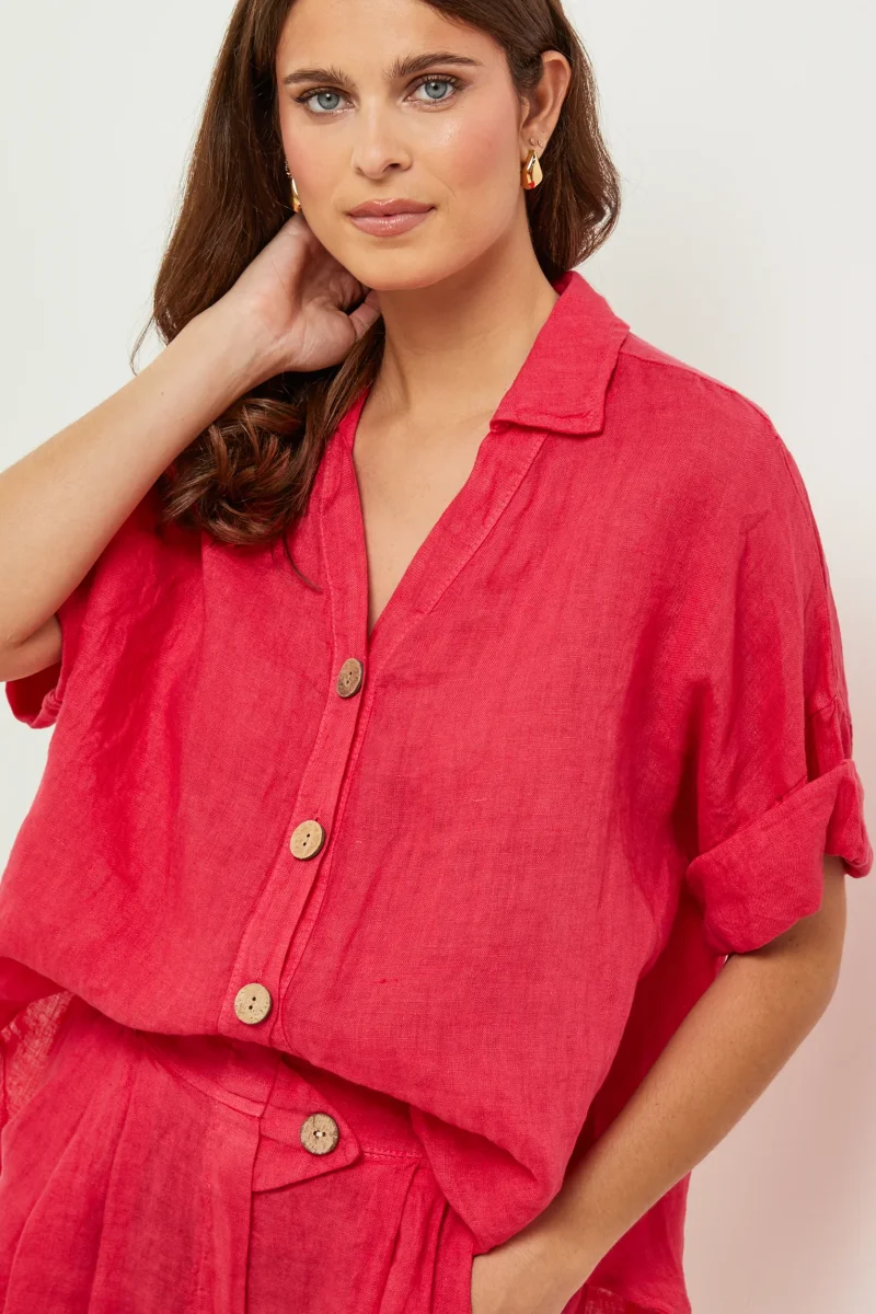 Chemise large à manches courtes, col V et boutonnée sur le devant100% LINLavage en machine, en dessous de 30 ° C