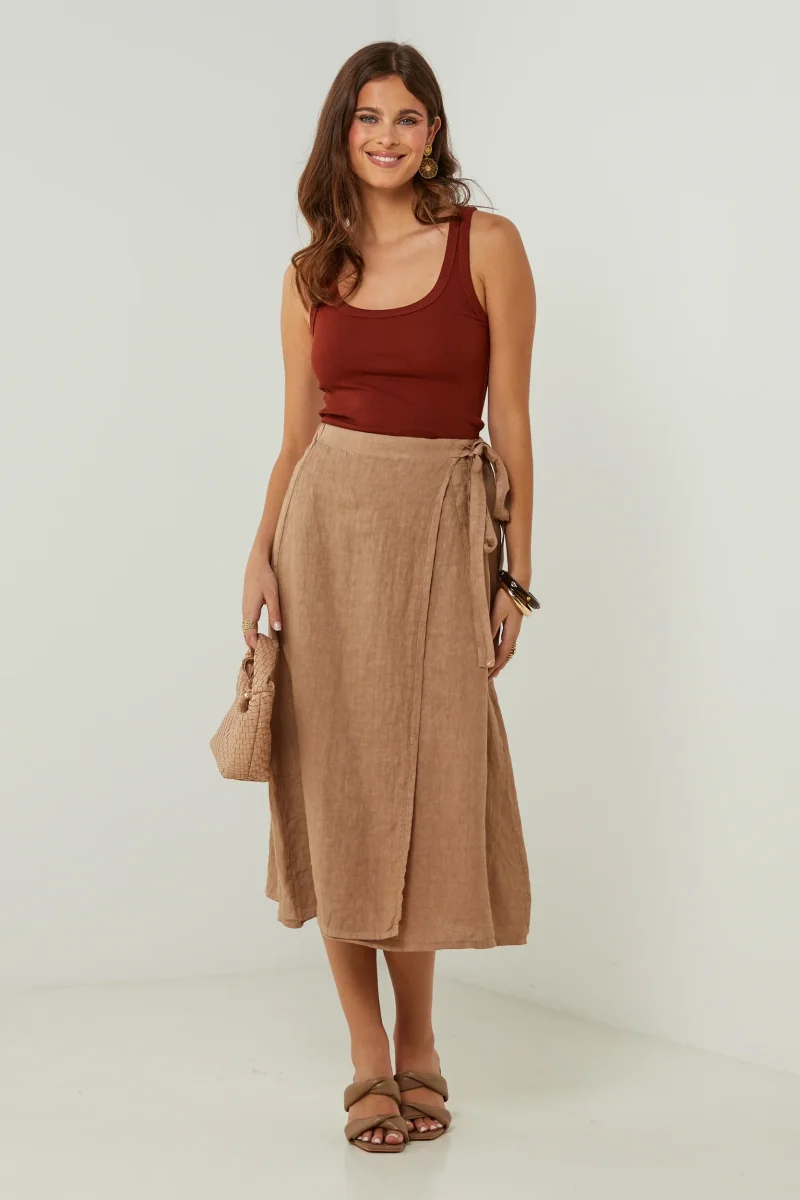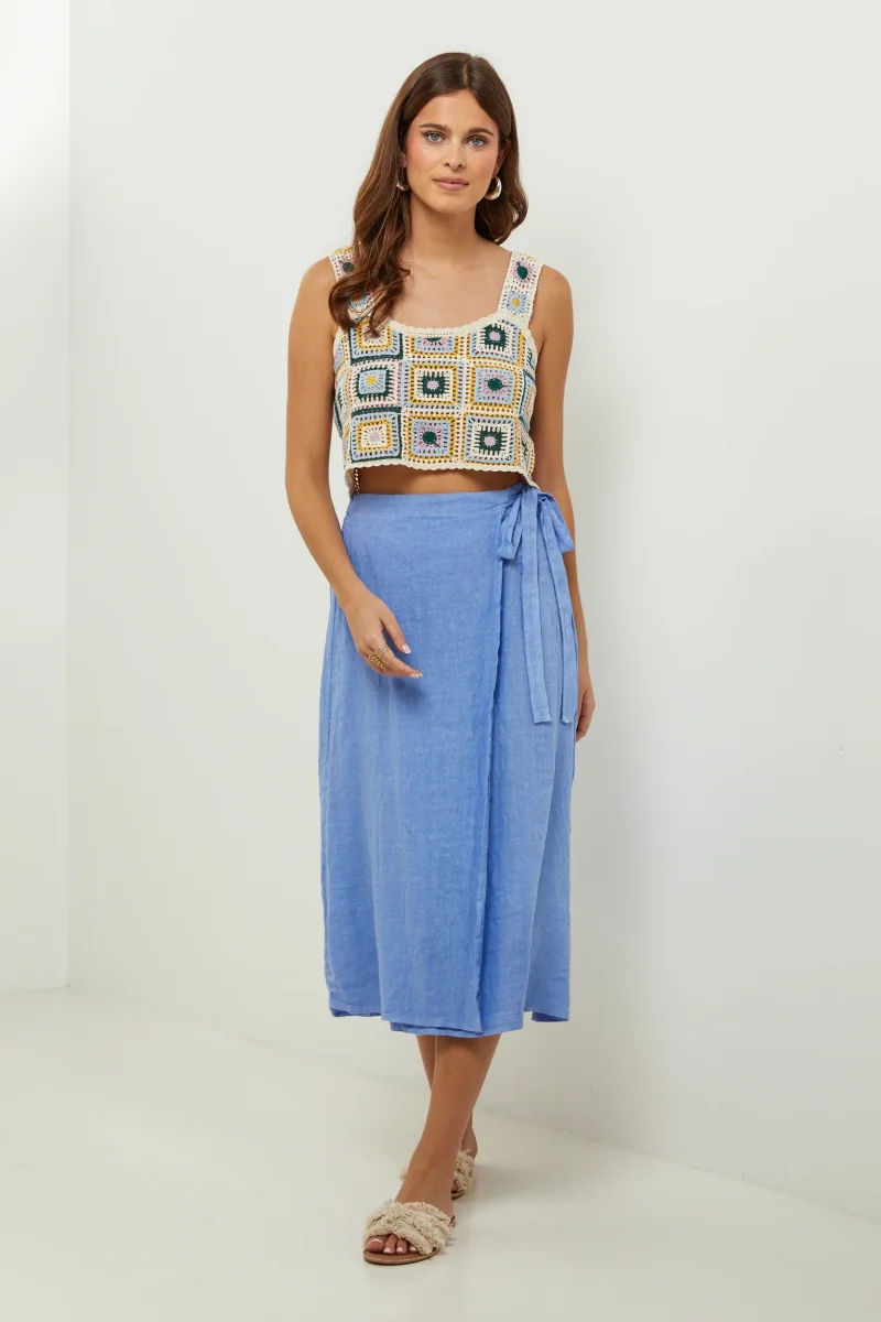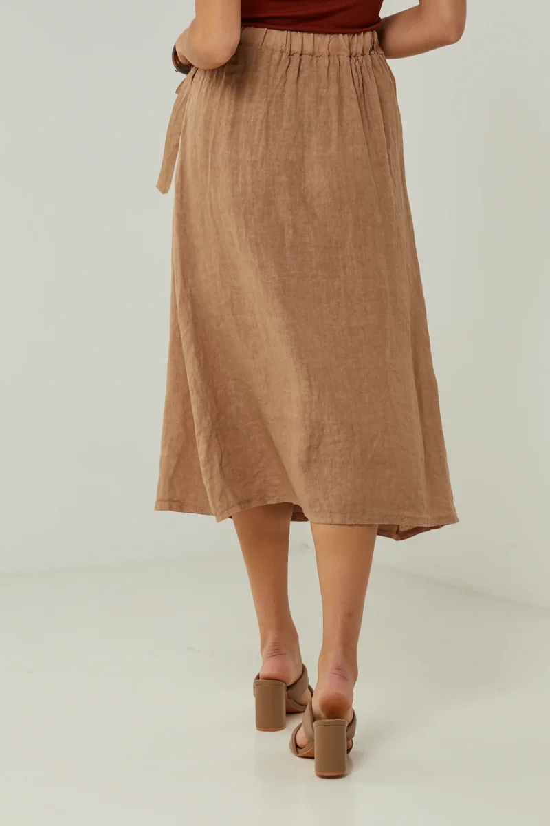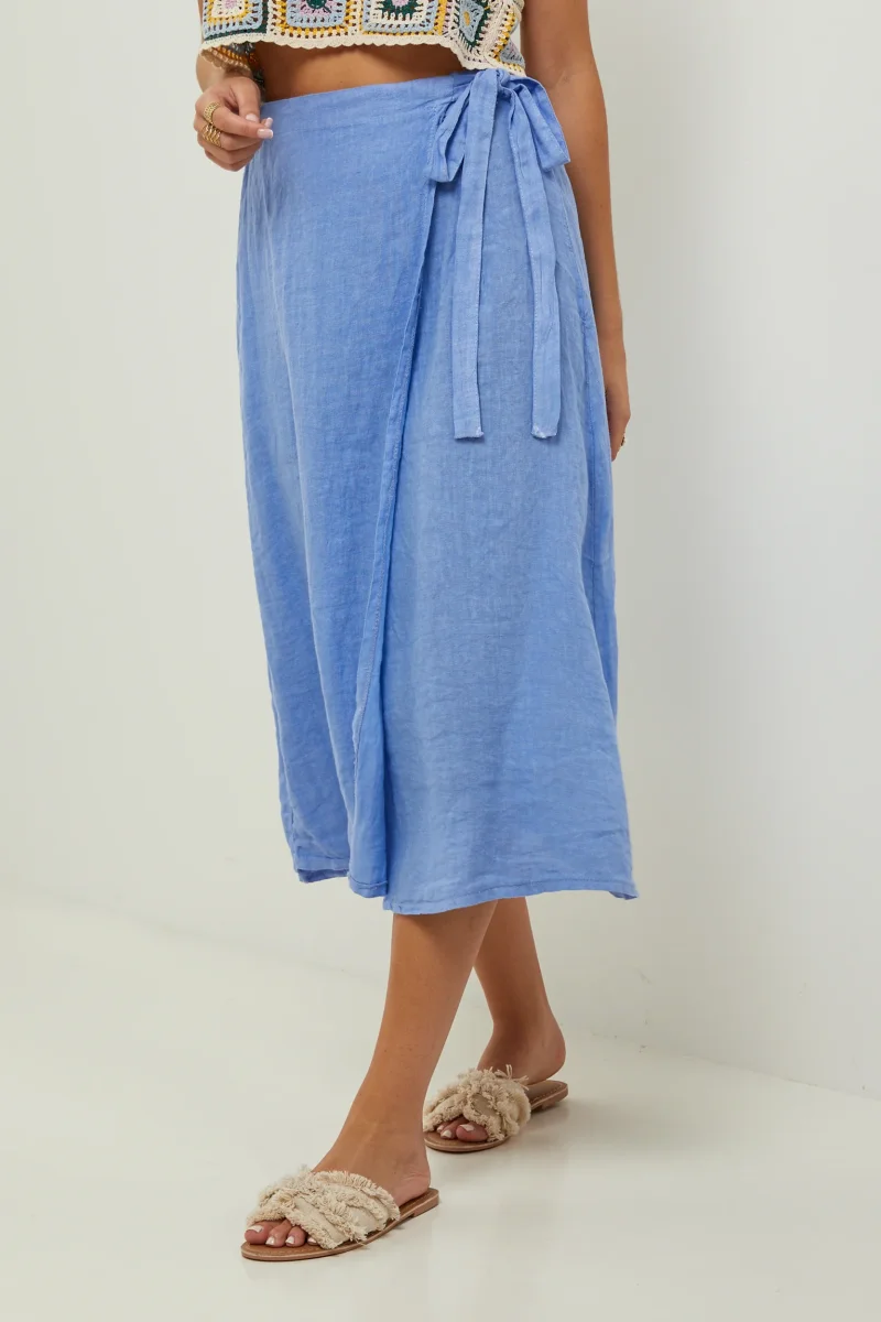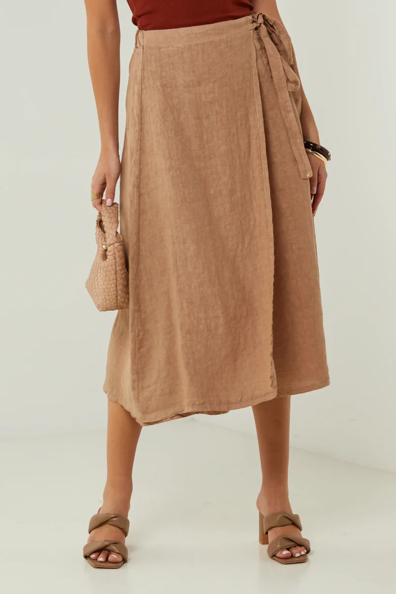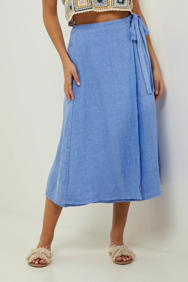 Jupe portefeuille longueur midi, fermeture par nœud, ajustable à la taille100% LINLavage en machine, en dessous de 30 ° C