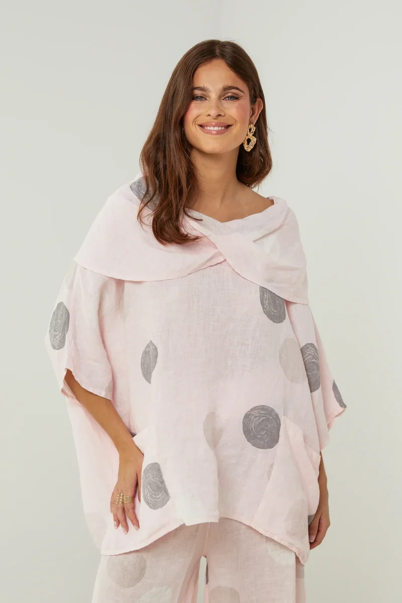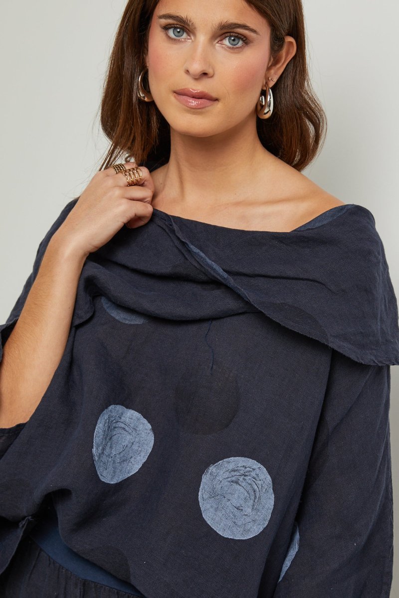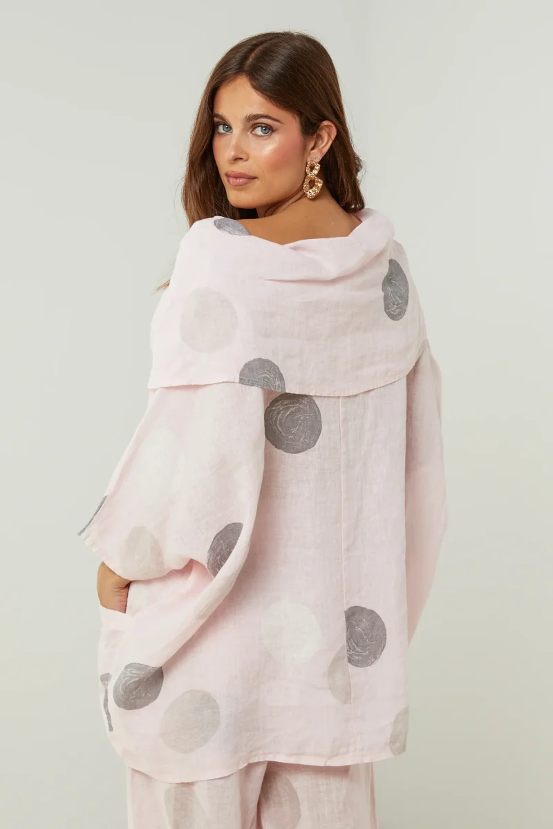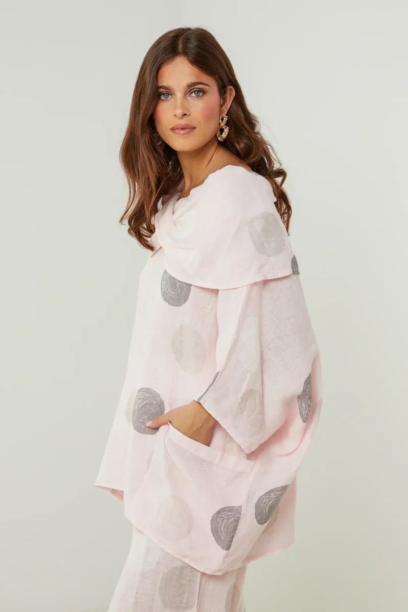 Tunique large à pois à encolure originale, avec poches plaquées sur le devant100% LINLavage en machine, en dessous de 30 ° C