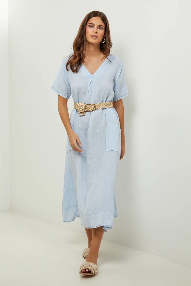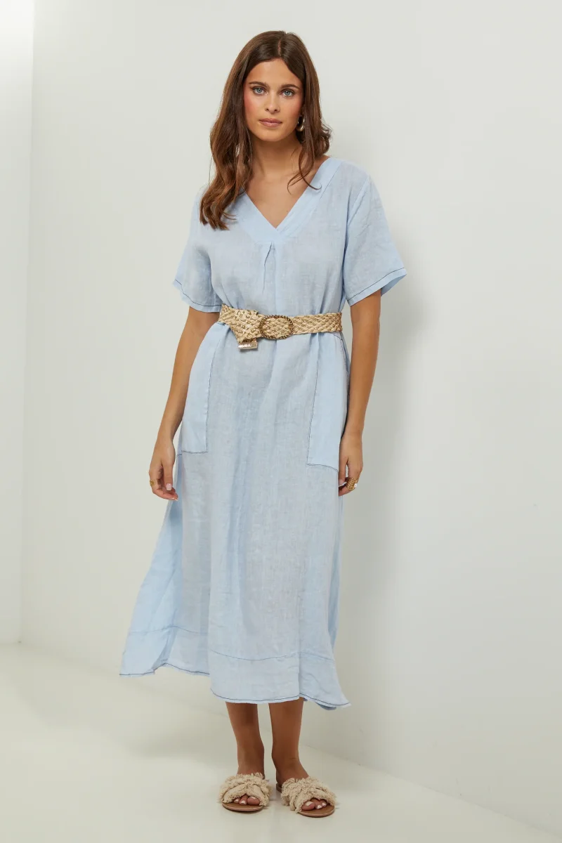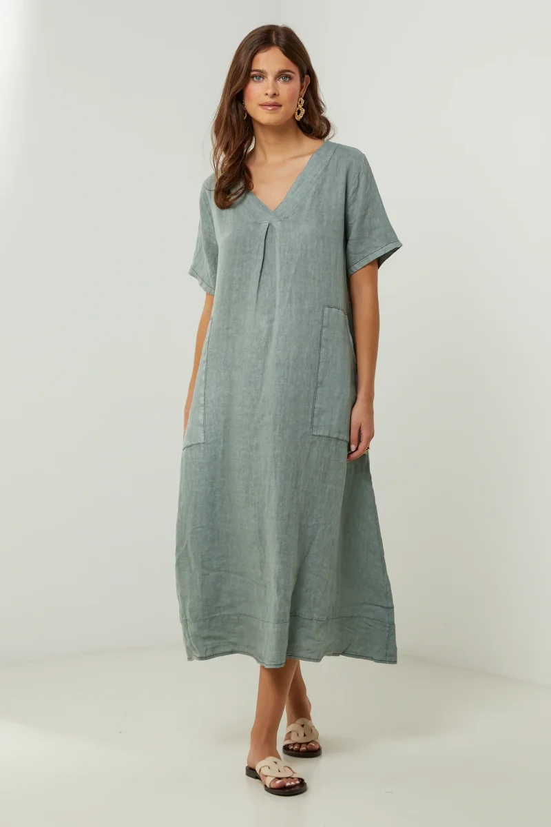 Robe large mi-longue, col V et manches courtes, avec deux poches plaquées sur le devant100% LINLavage en machine, en dessous de 30 ° C