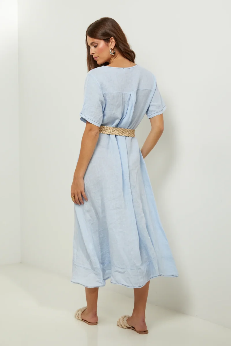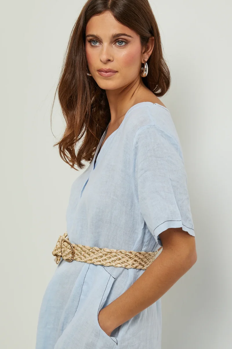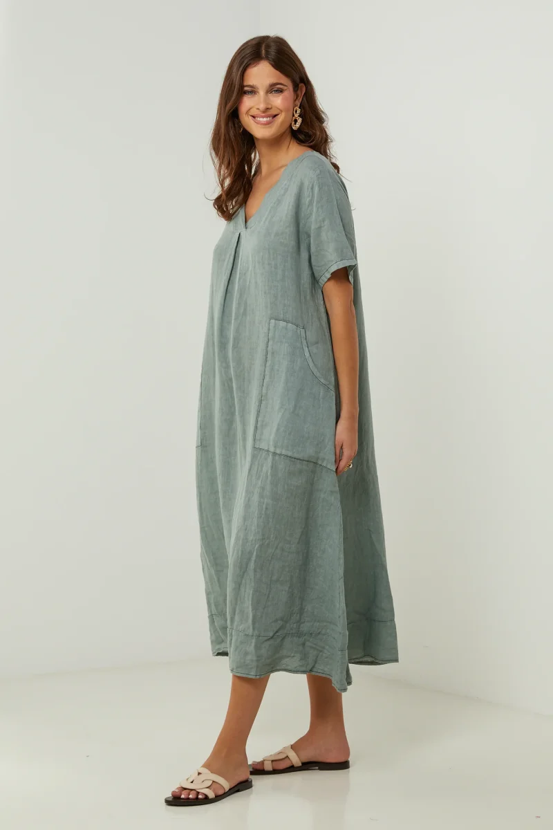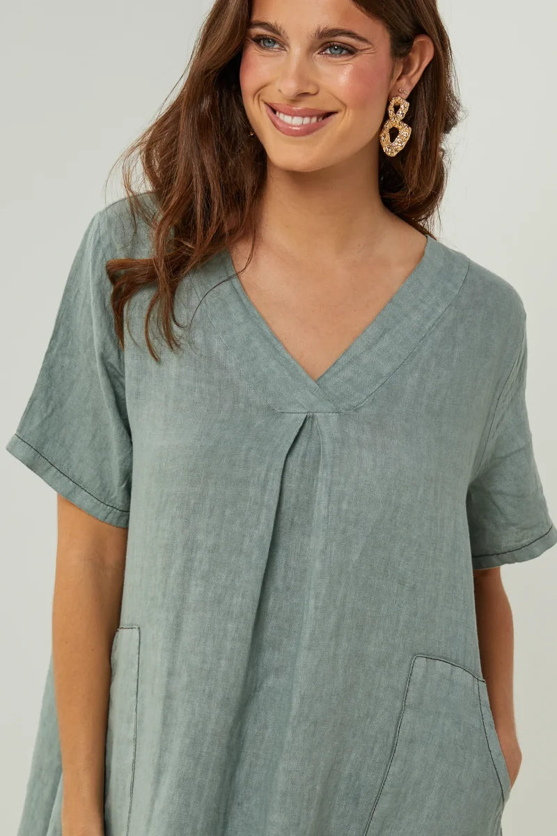Robe large mi-longue, col V et manches courtes, avec deux poches plaquées sur le devant100% LINLavage en machine, en dessous de 30 ° C