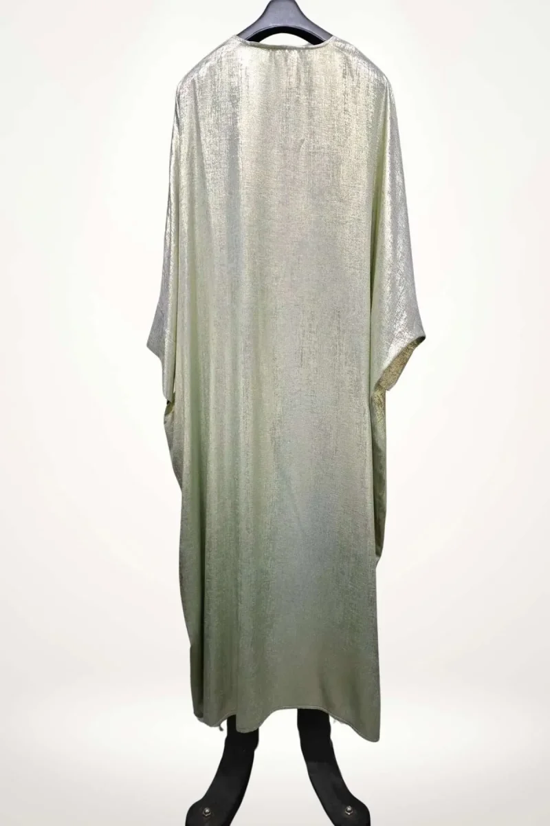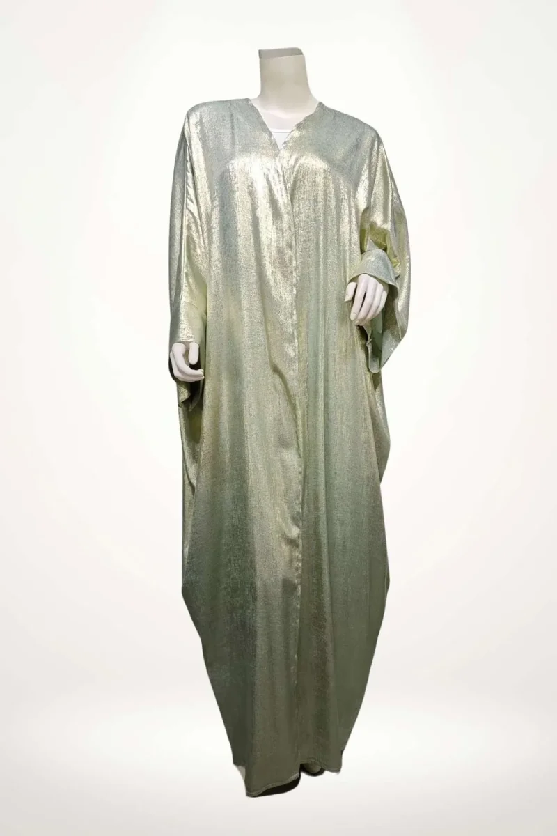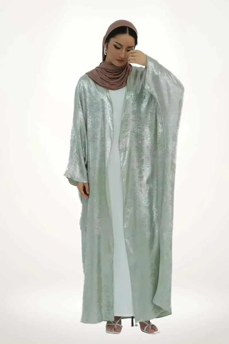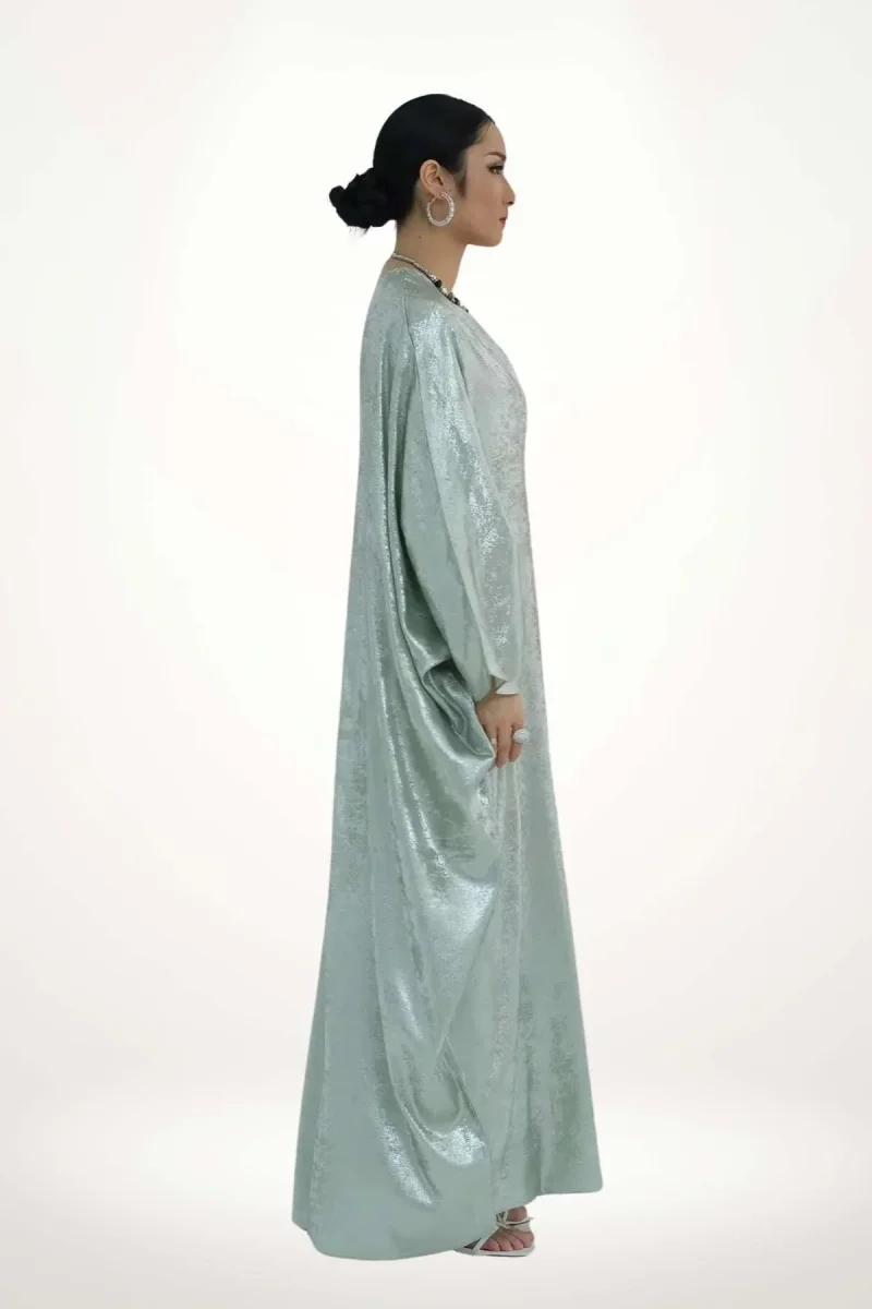 En bref : Ce kimono abaya femme dévoile une silhouette fluide et ample, portée ici en version longue jusqu’aux chevilles. Sa coupe droite s’accompagne de manches larges et tombantes, typiques des kimonos abaya, offrant une allure à la fois élégante et décontractée. La teinte vert d’eau irisée capte la lumière, révélant un subtil effet satiné qui souligne la délicatesse du tissu. Aucun accessoire ni ceinture obi ne vient interrompre cette ligne épurée et aérienne.