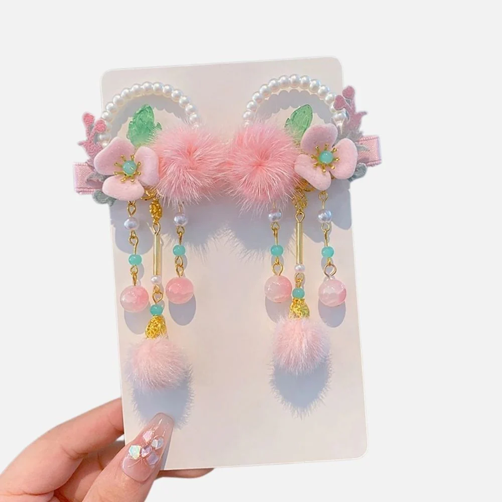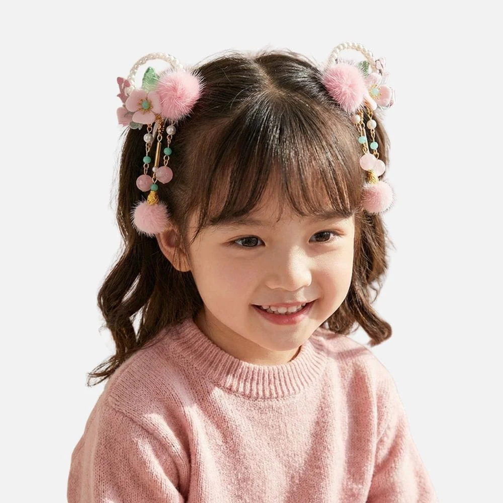 En bref : Ces accessoires cheveux enfant s’inspirent de la finesse japonaise avec leurs pompons roses duveteux, leurs perles nacrées et leurs petites fleurs en tissu. Chaque pièce est montée sur une base métallique ornée de détails dorés et colorés, apportant une touche à la fois festive et délicate.