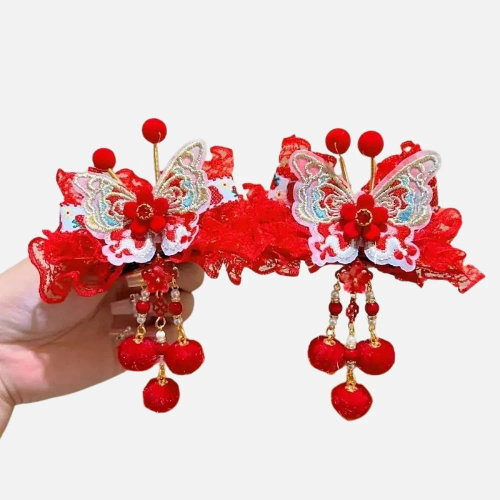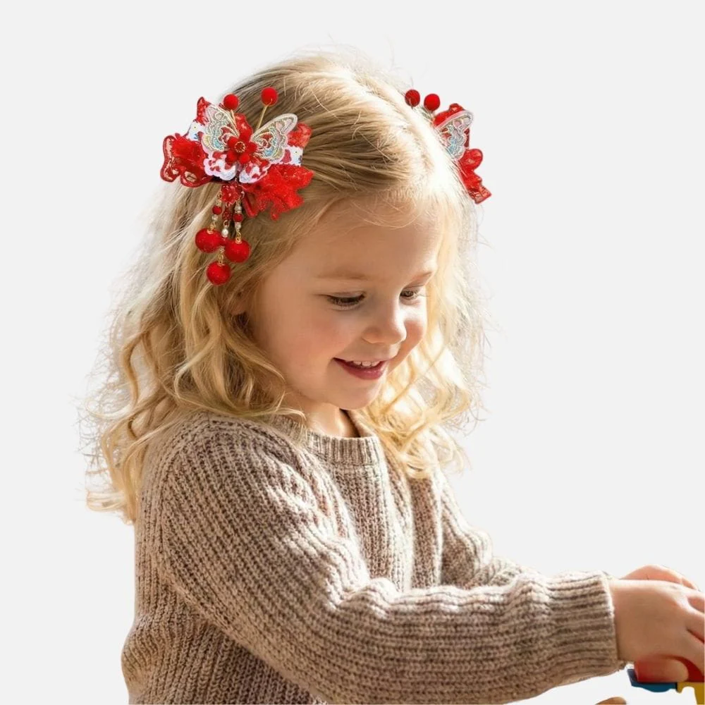 En bref : Ces accessoires cheveux fille s’inspirent de la délicatesse japonaise avec un design raffiné mêlant dentelle rouge, papillons brodés et pampilles suspendues. Chaque pièce présente une base rigide ornée de détails colorés et festifs, idéale pour sublimer une coiffure de fillette avec une touche traditionnelle et élégante. Ces accessoires cheveux fillette apportent une présence visuelle forte tout en restant délicats.