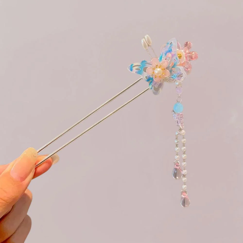 En bref : Ce pic cheveux délicat et raffiné se distingue par ses motifs floraux et papillons aux teintes pastel, agrémentés de perles artificielles et d’une chaîne pendante élégante. Un accessoire subtil pour sublimer vos coiffures avec grâce.