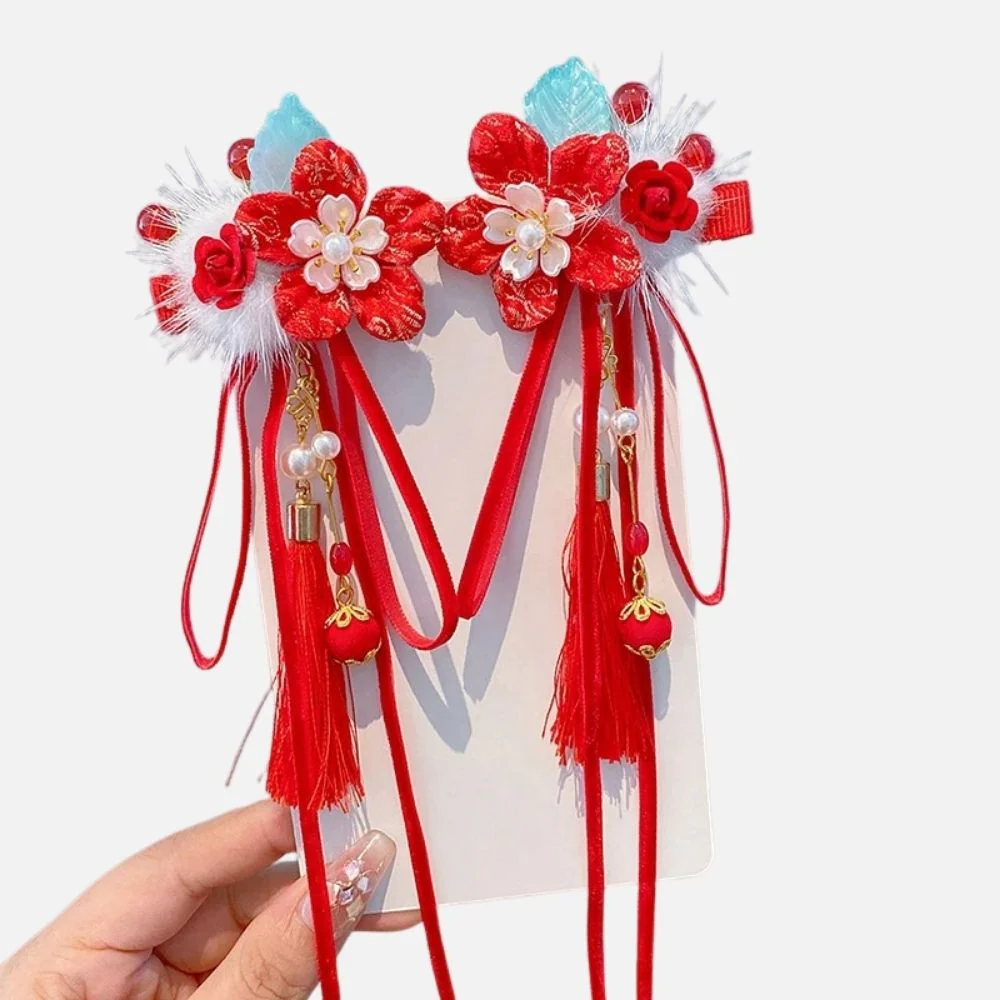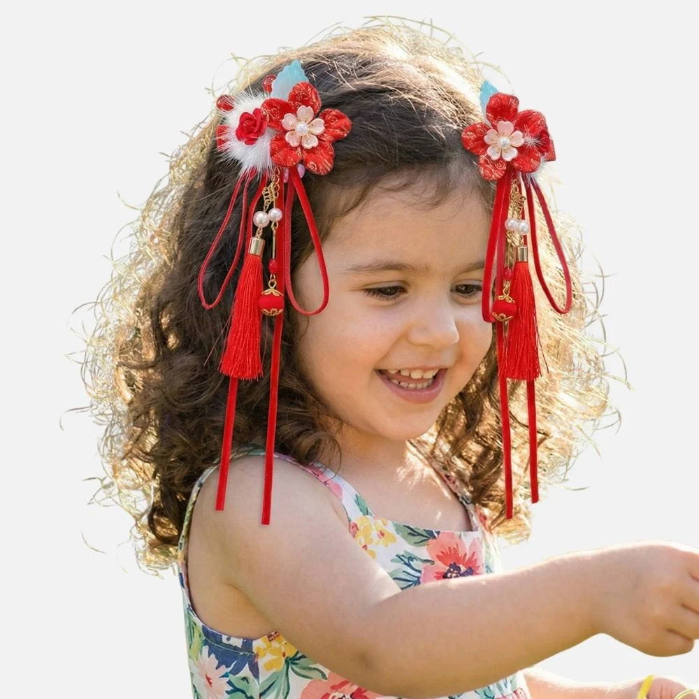 En bref : Ce duo d’accessoires cheveux fillette met en avant de délicates fleurs rouges satinées ornées de perles et de rubans longs. Les pampilles et détails dorés apportent une touche festive, tandis que la pince rigide assure un maintien fiable et confortable.