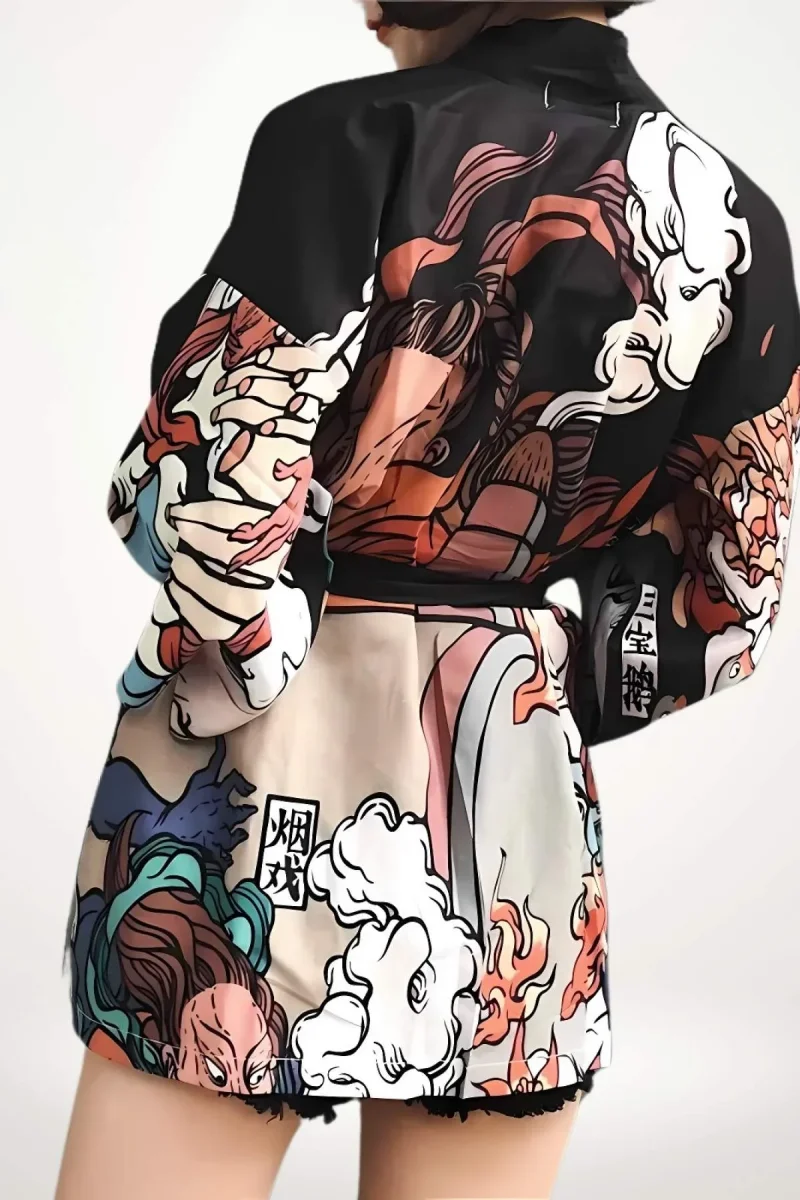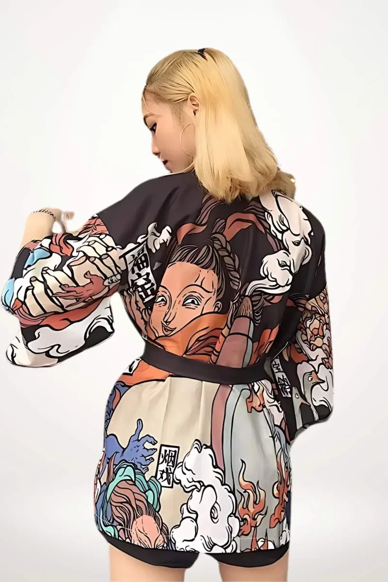 En bref : Cette veste femme kimono courte dévoile une silhouette fluide et décontractée, portée ici sans ceinture obi. Sa coupe ample aux manches larges trois-quarts s’inspire des kimonos traditionnels tout en adoptant une longueur résolument moderne, juste au-dessus des cuisses. Le motif graphique, mêlant personnages stylisés et nuages de fumée dans des teintes chaudes et contrastées, donne à ce kimono femme veste une allure audacieuse et contemporaine.