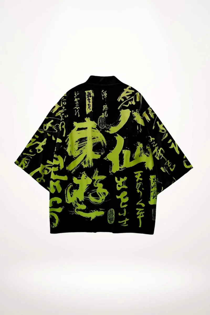 • Style : La coupe ample et les manches larges créent un jeu de volumes typique des vestes kimono femme, tandis que le motif calligraphique vert sur fond noir apporte une touche contemporaine et graphique.