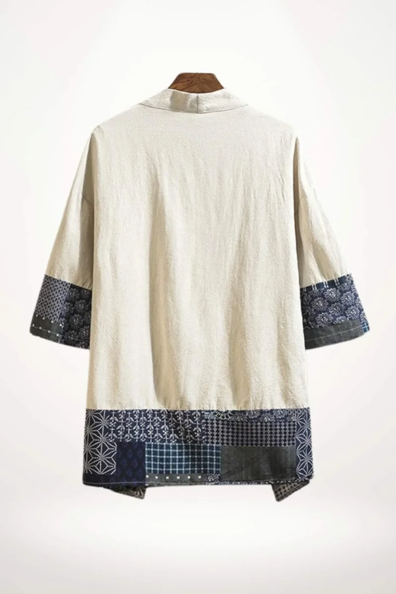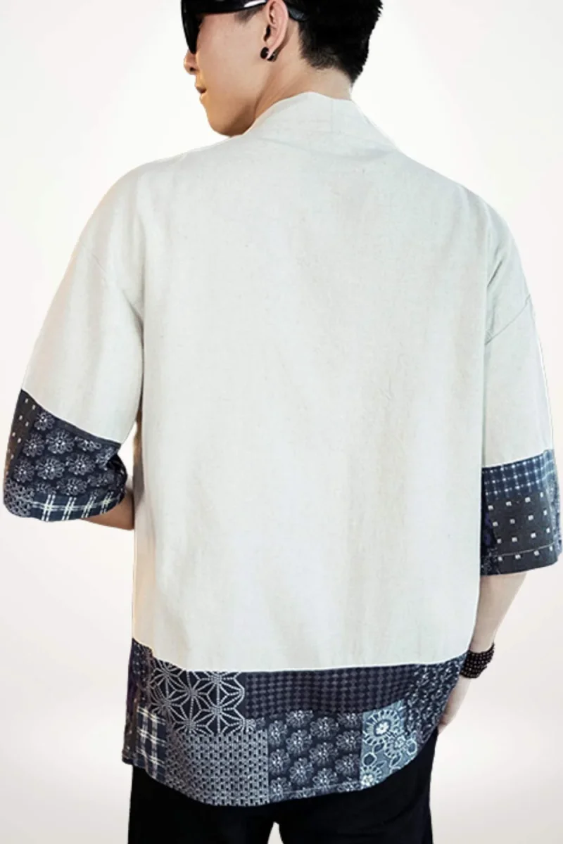 La coupe ample de ce kimono homme veste apporte une liberté de mouvement appréciable, tandis que ses manches mi-longues s’arrêtent juste en dessous du coude, renforçant son esprit contemporain. Le bas de la veste et les manches sont ornés d’un patchwork de motifs traditionnels japonais en bleu marine, mêlant fleurs, carreaux et formes géométriques, qui apportent une signature visuelle forte et raffinée.