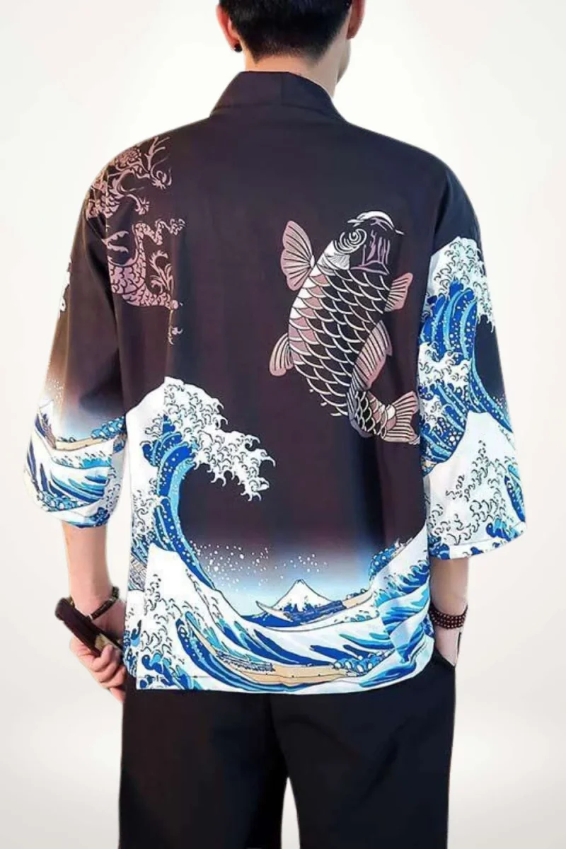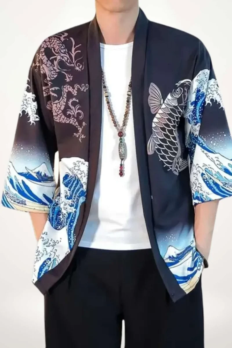En bref : Ce cardigan kimono homme déploie une silhouette ample et fluide, avec des manches larges et une longueur courte qui s’arrête au-dessus des hanches. Son imprimé saisissant mêle la puissance d’un dragon et la noblesse d’une carpe koi, sur un fond noir profond rehaussé par des vagues dynamiques en bleu et blanc. Une pièce qui conjugue esthétique japonaise et modernité, pensée pour un style affirmé et décontracté.