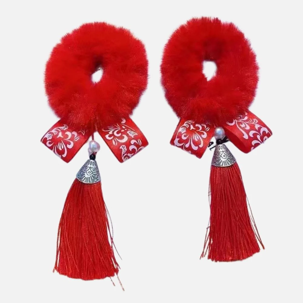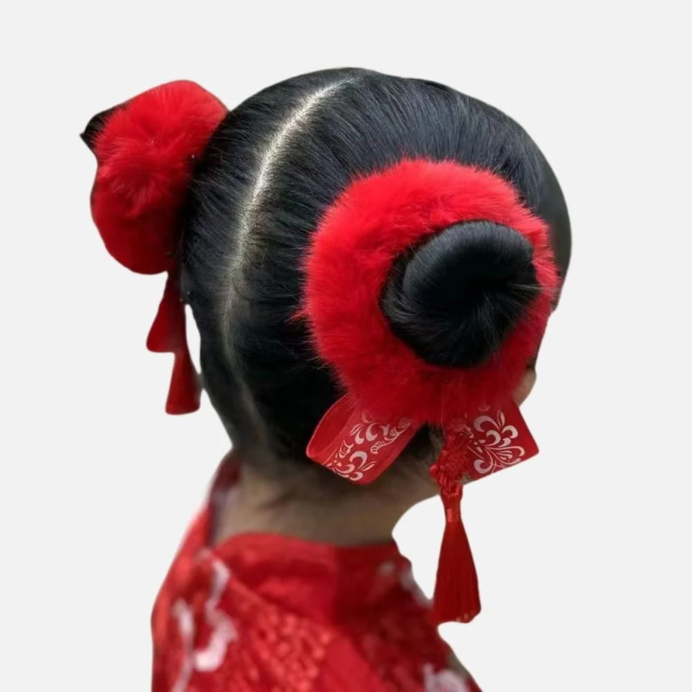 En bref : Ce chouchou rouge apporte une touche festive et élégante à la coiffure. Son anneau duveteux intense, accompagné d’un ruban rouge à motifs floraux blancs et d’une longue pampille assortie, crée un accessoire cheveux fille raffiné, léger et visuellement captivant.