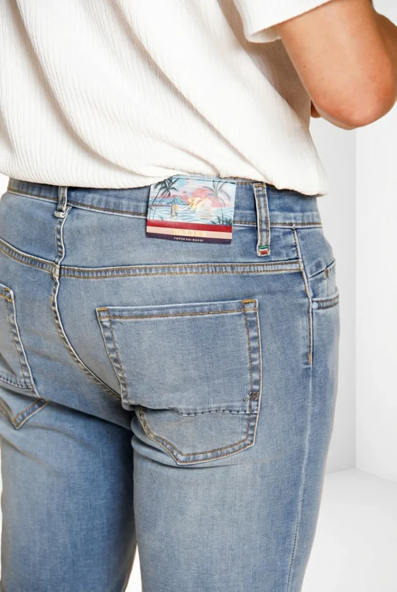 Harris pantalone 5 tasche uomo in denim lavaggio chiaro stampa Hawaii slim fit
