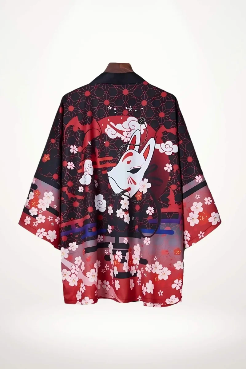 Le motif central du masque kitsune, emblématique et chargé de symboles, s’impose avec élégance sur un fond noir rehaussé de nuances rouges et roses. Les fleurs de cerisier, délicatement dispersées, apportent une touche de douceur et de féminité. La veste kimono femme joue avec les contrastes, entre force graphique et légèreté poétique.