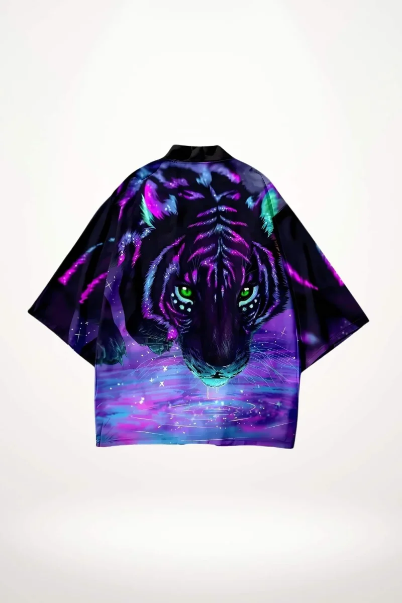 Le graphisme du tigre, vibrant de couleurs électriques, capte le regard et donne vie à ce kimono femme veste. La palette de violets profonds et de bleus mystiques crée un contraste saisissant avec les yeux verts, apportant une dimension presque hypnotique.