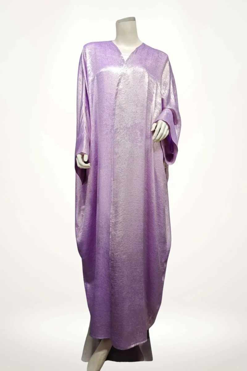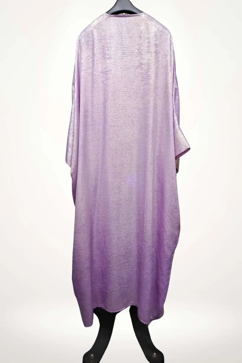 Le mélange subtil de violet et d’argenté crée un effet visuel captivant, qui évolue selon la lumière. La coupe ample et les manches larges invitent à un port décontracté, tout en conservant une présence forte et distinguée. Sans ceinture ni accessoires, cette abaya femme kimono mise sur la pureté de ses formes et la qualité de sa matière satinée.