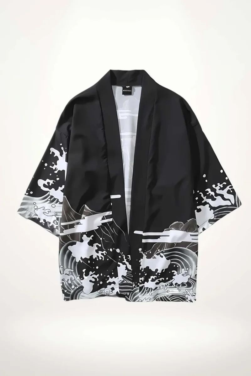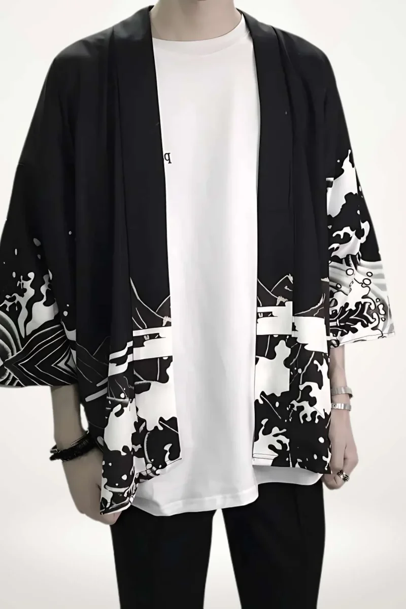 En bref : Cette chemise kimono pour homme déploie un univers graphique saisissant, mêlant un dragon sinueux à des vagues déchaînées sur fond noir profond. Sa coupe ample et ses manches larges offrent une silhouette fluide et décontractée, tandis que la longueur courte s’arrête juste au-dessus des hanches. Un kimono yukata homme moderne, qui s’impose par son contraste monochrome et ses détails minutieux, très agréable pour affirmer une allure contemporaine et pleine de prestance.