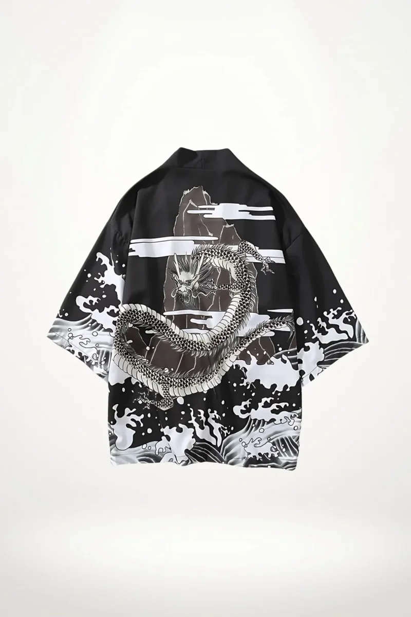 Le dos de cette chemise kimono pour homme est orné d’un dragon en mouvement, finement dessiné, qui serpente au-dessus de vagues stylisées. Les manches larges et la coupe droite renforcent la liberté de mouvement et la décontraction. La bordure noire unie sur le devant offre un contraste élégant avec le motif dynamique du reste du vêtement.