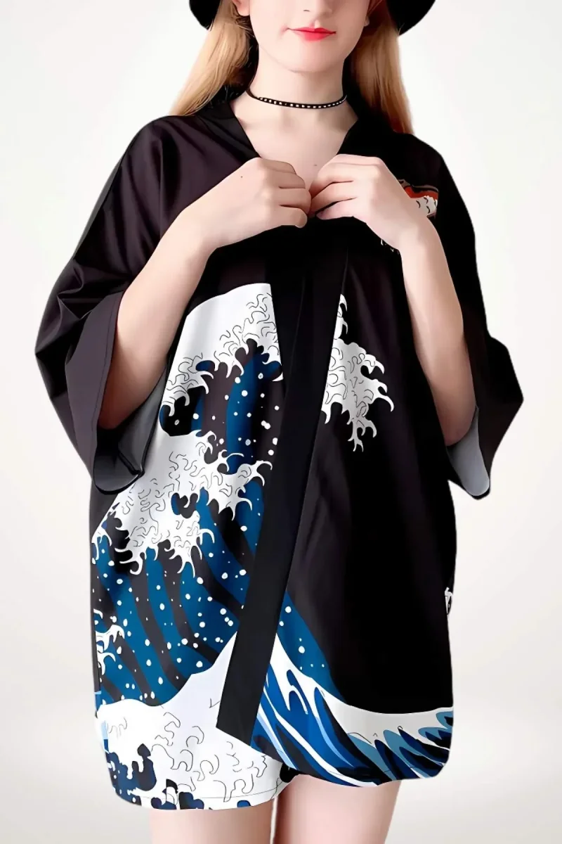 En bref : Ce kimono veste femme s’impose par sa silhouette ample et fluide, portée ici sur une tenue minimaliste. Sa coupe droite et ses manches larges trois-quarts offrent une aisance naturelle, tandis que le motif inspiré de la célèbre estampe japonaise « La Grande Vague » apporte une touche artistique et contemporaine. Le fond noir profond met en valeur les nuances de bleu et blanc des vagues, ainsi que les touches discrètes de rouge sur les carpes koi, pour un équilibre harmonieux et élégant.