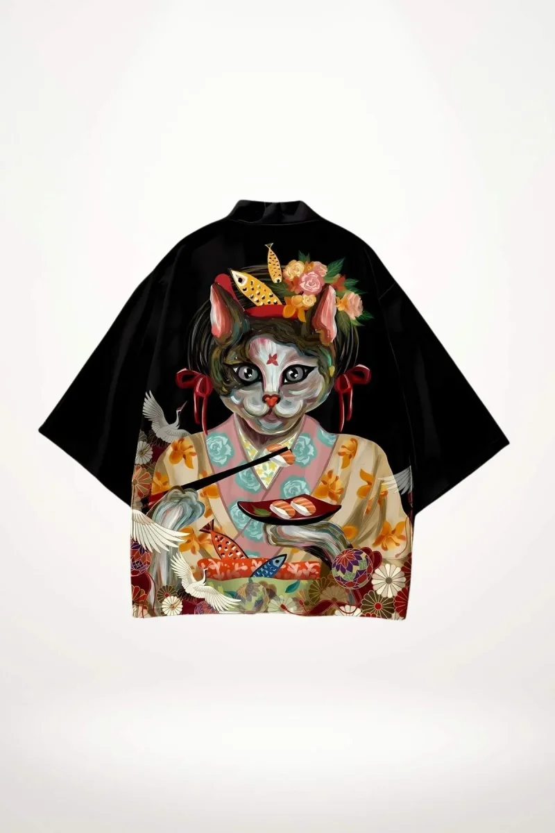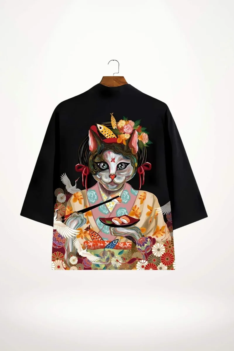 En bref : Cette veste kimono noire se distingue par sa silhouette ample et ses manches larges, typiques du kimono traditionnel. Le dos révèle un motif saisissant : un chat anthropomorphe vêtu d’un kimono coloré, tenant des baguettes et un plateau de sushi, entouré de fleurs et de grues blanches. Le contraste entre le fond noir uni et ce décor riche en couleurs crée une allure à la fois moderne et empreinte d’une esthétique japonaise raffinée.