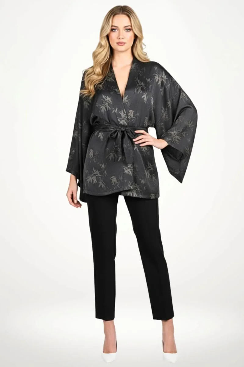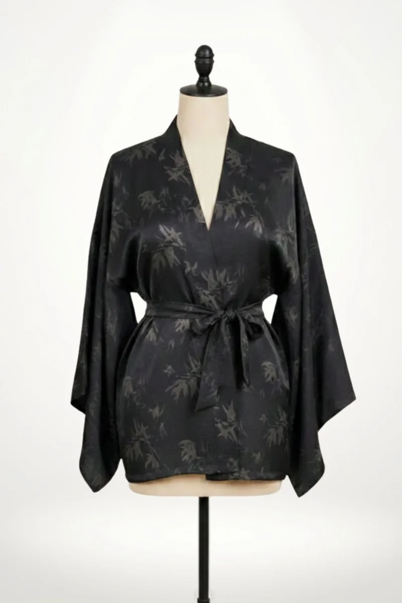 En bref : Cette veste kimono noire s’inspire directement du haori japonais traditionnel, revisité avec une coupe moderne et fluide. Sa silhouette ample et courte, ceinturée à la taille, dessine une allure élégante et féminine. Le tissu satin noir, délicatement orné d’un motif feuillage ton sur ton, apporte une profondeur subtile et raffinée. Une pièce pensée pour une veste kimono femme chic, à porter en toute simplicité.