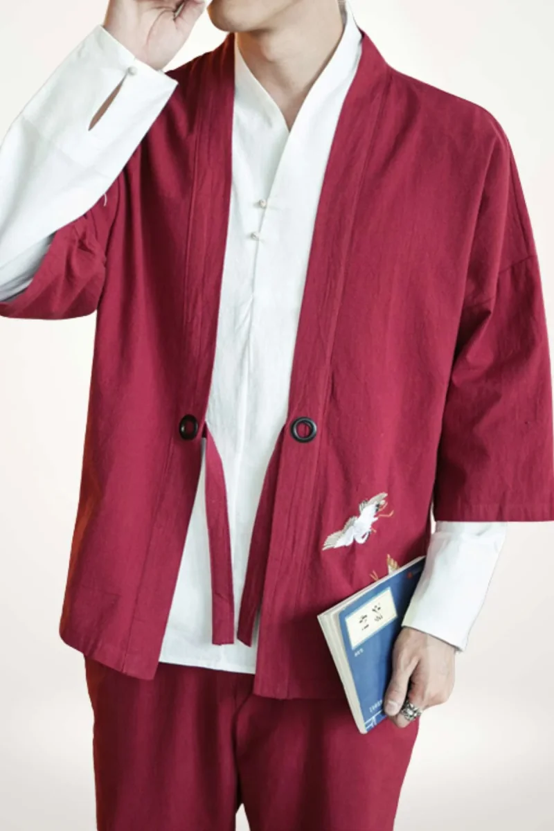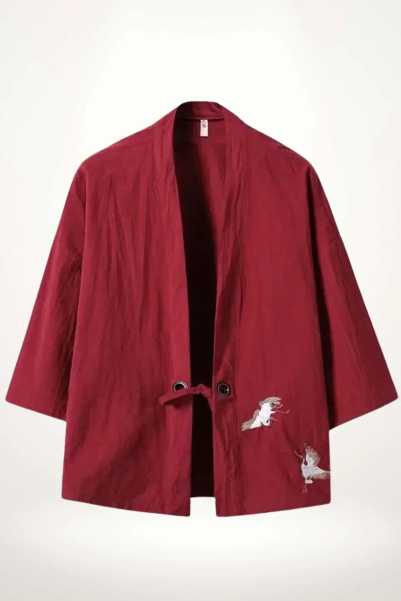 Les broderies de grues blanches et dorées, placées sur le devant et la manche, apportent une touche d’artisanat et de délicatesse. La fermeture par liens plats, discrète et fonctionnelle, rappelle les attaches traditionnelles du blazer kimono homme.