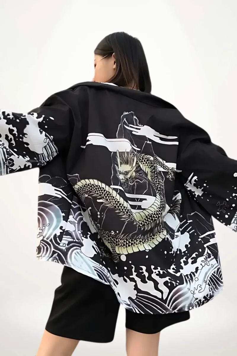 En bref : Cette veste style kimono se déploie en une silhouette ample et fluide, portée ici sur un short noir pour un contraste moderne. Ses manches larges et trois-quarts prolongent l’esprit traditionnel tout en offrant une aisance naturelle. Le noir profond sert de toile de fond à un motif spectaculaire : un dragon sinueux s’élance au milieu d’une mer agitée, en blanc et nuances de gris, évoquant la force et le mystère. L’ouverture frontale sans bouton ni ceinture souligne la simplicité élégante de cette veste légère kimono femme.