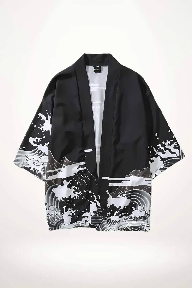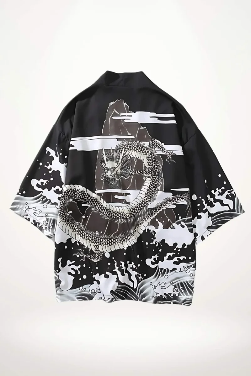 • Style : Coupe ample, manches larges trois-quarts, absence de ceinture, imprimé dragon et vagues en noir, blanc et gris, pour une kimono veste légère au design fort et contemporain.