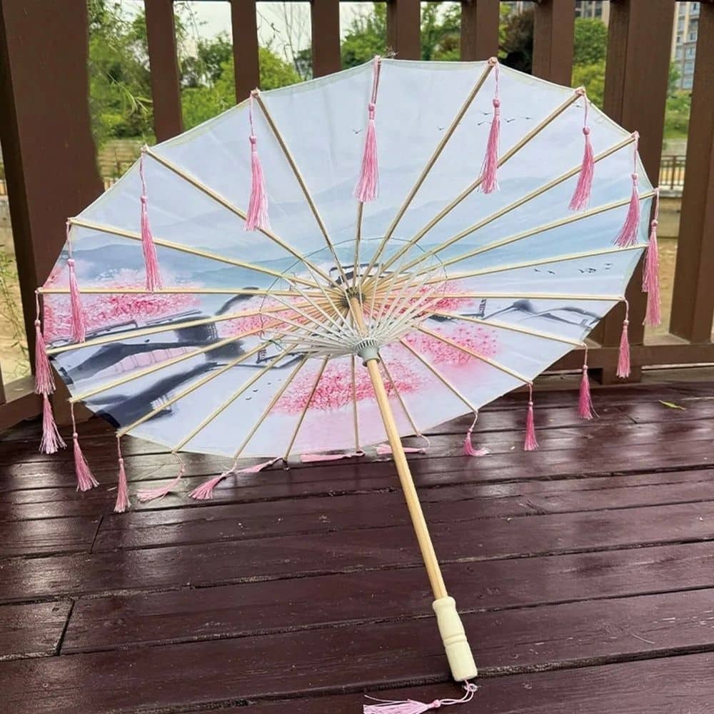 - Finitions : Chaque branche est ornée d’un pompon rose qui ponctue délicatement le pourtour de l’ombrelle, soulignant son allure traditionnelle et décorative.