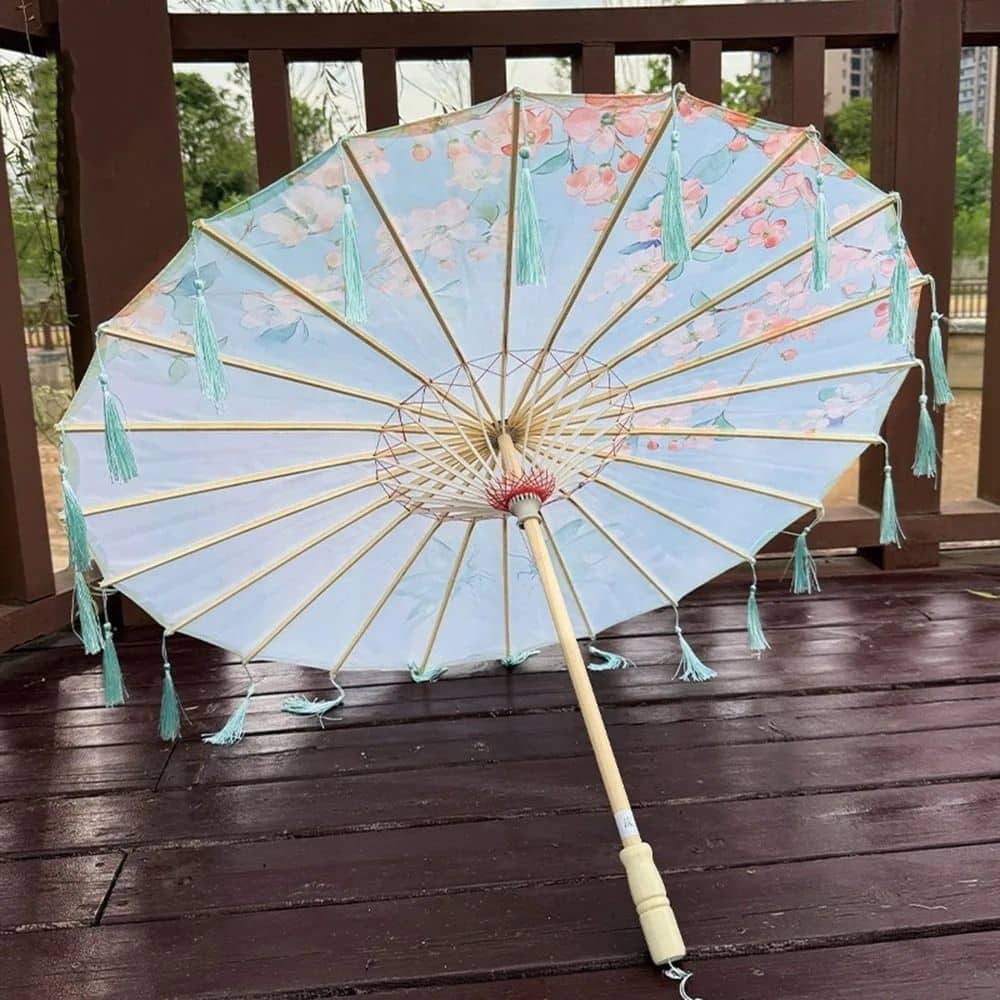 En bref : Cette ombrelle fleurie s’illustre par son tissu de soie délicatement imprimé de motifs floraux dans des tons pastel. Sa structure en bois clair, agrémentée de pompons turquoise suspendus sur le pourtour, lui confère une élégance traditionnelle et légère. Idéale pour créer une ombre protectrice face au soleil lors d’événements ou en décoration.