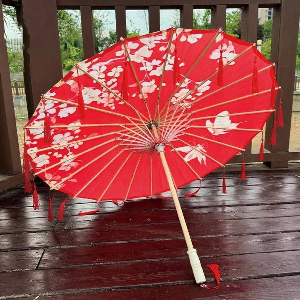 - Structure :La structure est composée d’une armature en bois clair, fine et robuste, qui soutient parfaitement la toile. La poignée droite, également en bois, se termine par un cordon rouge décoratif qui accentue le charme traditionnel de l’ombrelle japonaise rouge.
