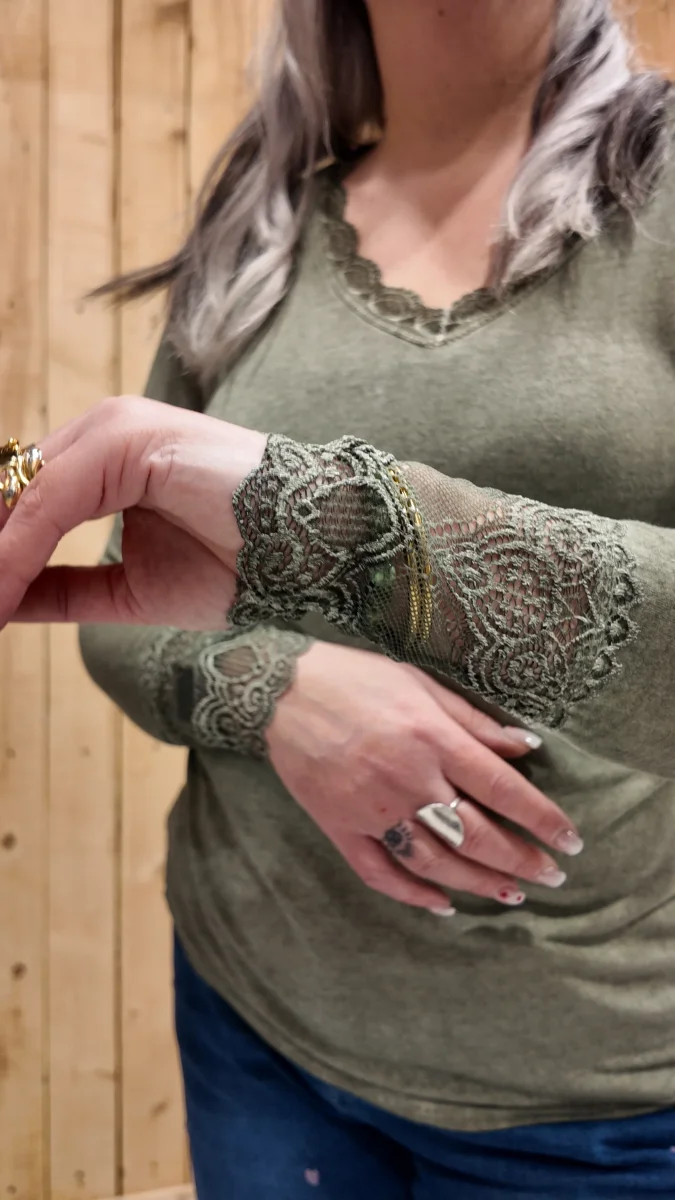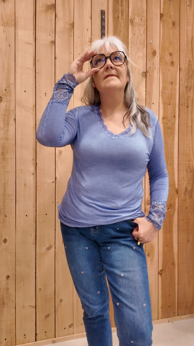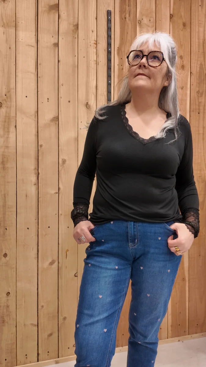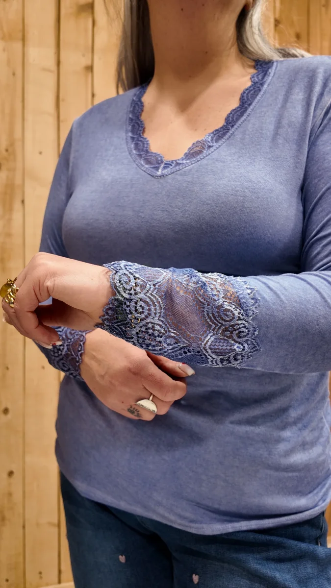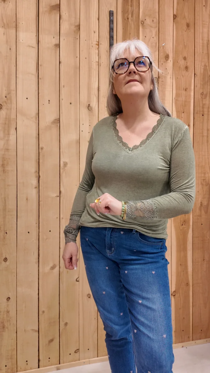 Tee -Shirt manches longues col V dentelle – Le basique chic qui sublime tout