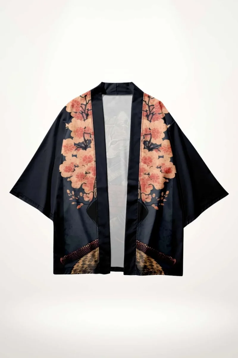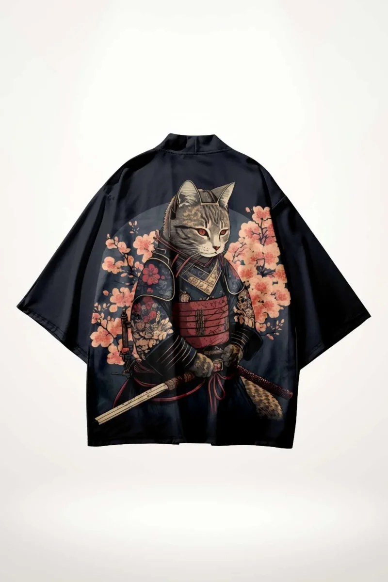 Le dos de ce cardigan style kimono homme se pare d’un motif central fort : un chat en armure samouraï, finement dessiné, qui tient une épée dans ses pattes avant. Les fleurs de cerisier encadrent ce personnage, apportant une touche poétique et traditionnelle. L’ouverture frontale est simple, sans bouton ni ceinture, laissant la silhouette respirer et s’exprimer librement.