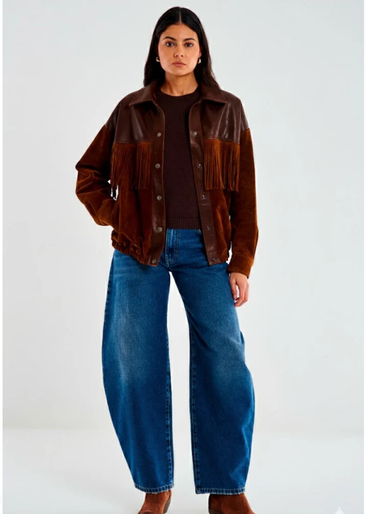 ✨ Veste forme bombers à frange cuir marron avec doublure