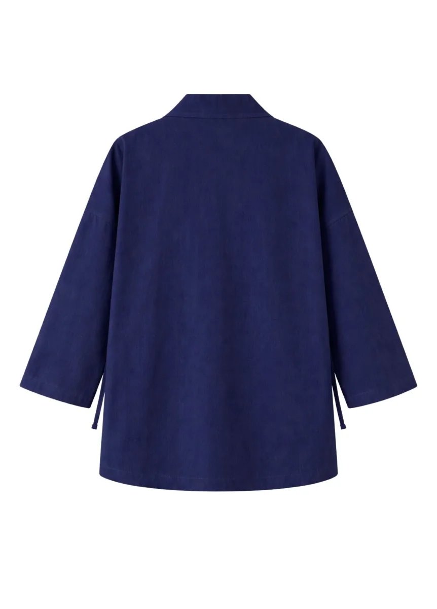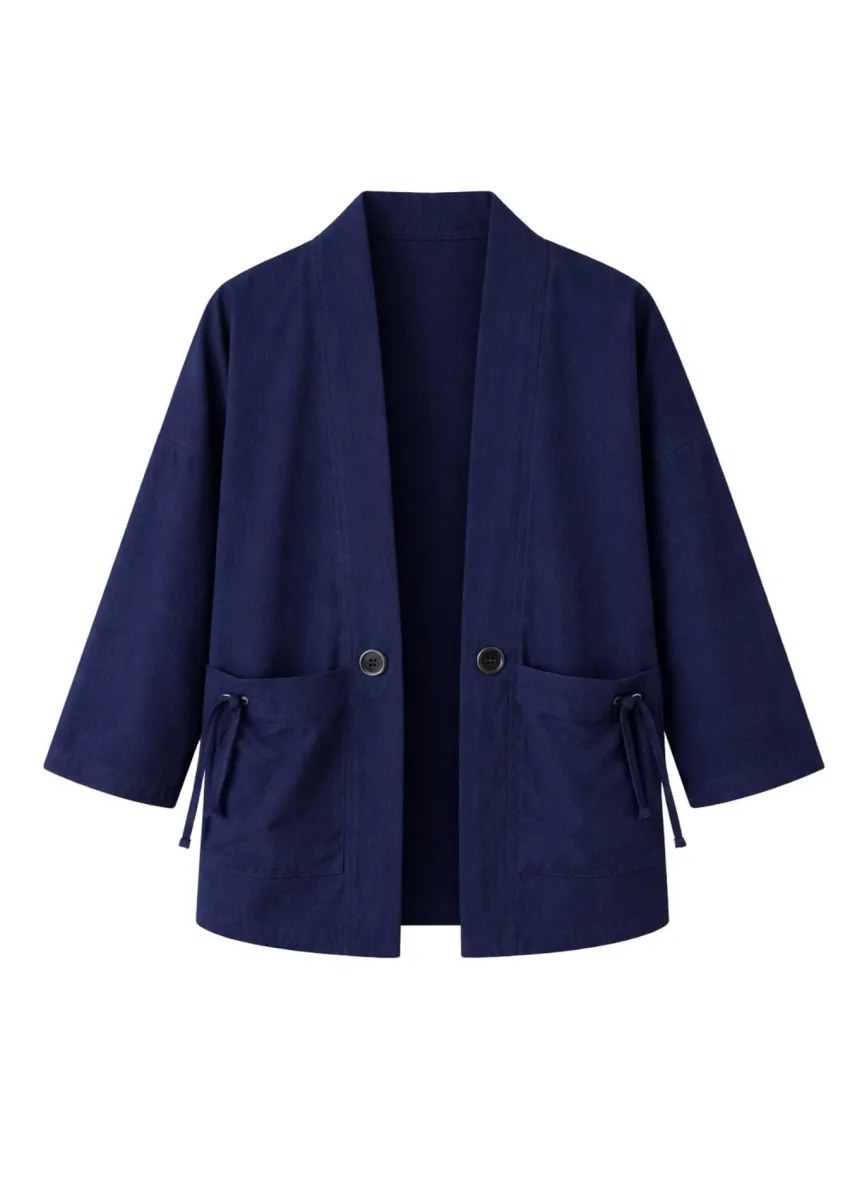 La coupe ample et structurée de cette veste kimono met en valeur le buste sans contraindre les mouvements. Les manches trois-quarts renforcent son allure contemporaine, tandis que la longueur étudiée permet un porté harmonieux, ouvert ou ceinturé. Cette veste kimono bleu marine offre une silhouette élégante, à la fois naturelle et affirmée.