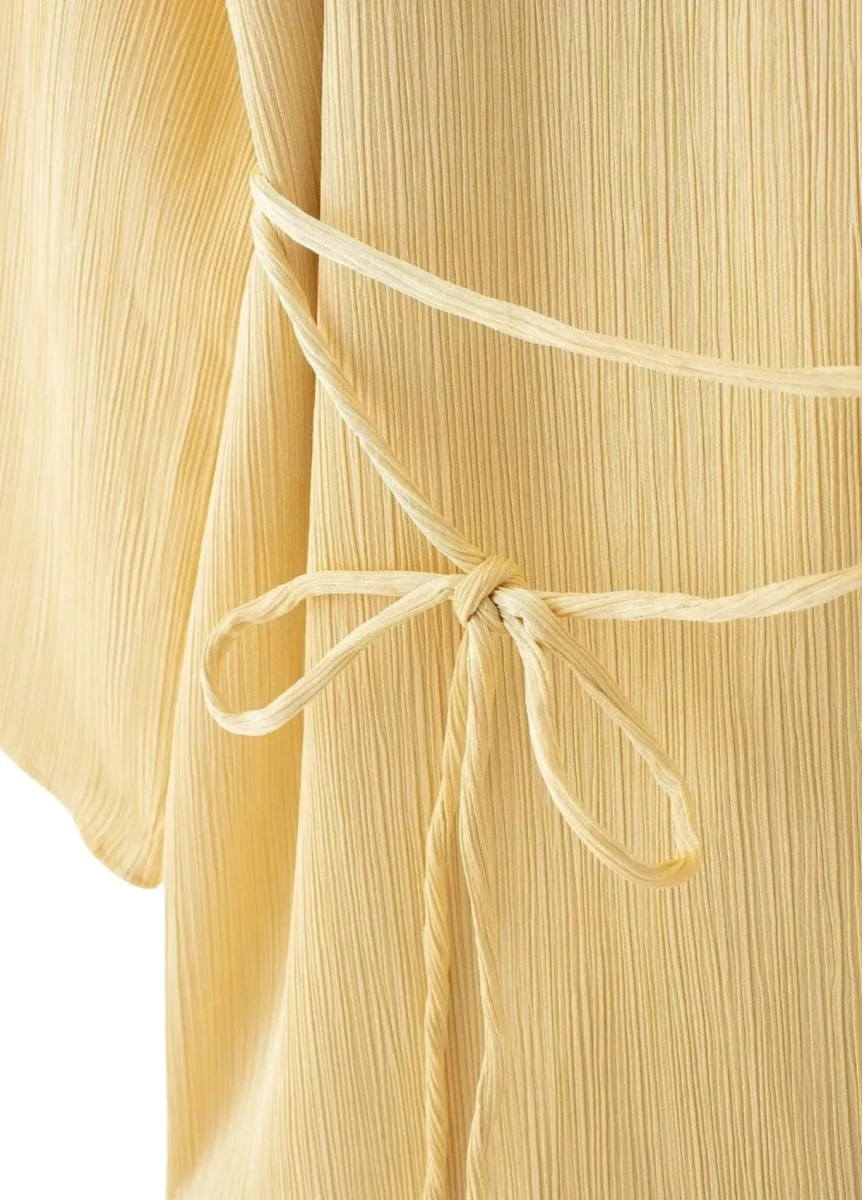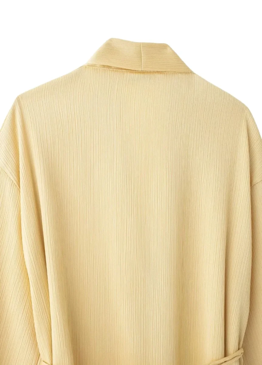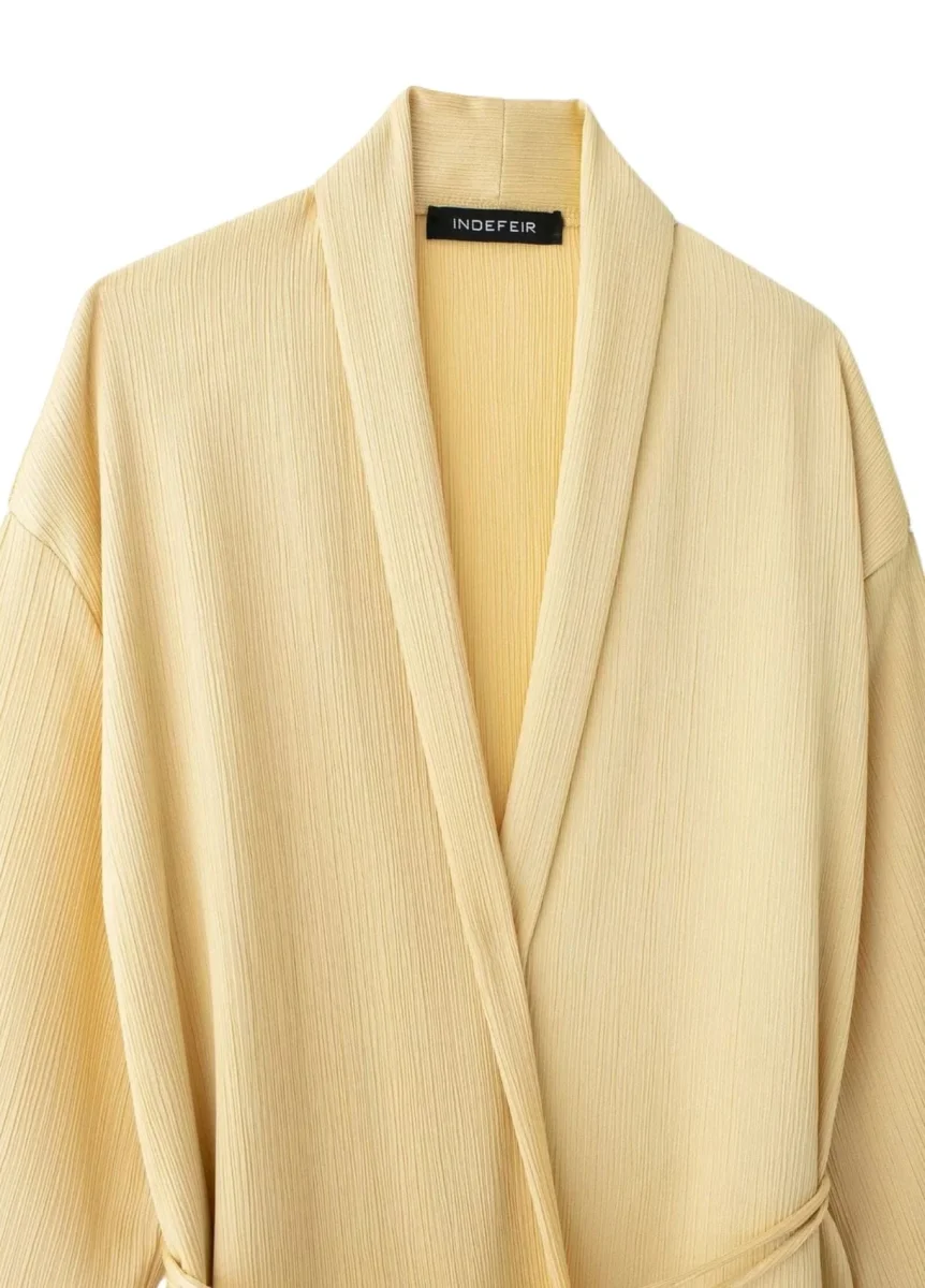La longueur cheville apporte une présence visuelle affirmée tout en conservant une grande aisance au porté. Le tombé est harmonieux, offrant une sensation enveloppante sans alourdir la tenue. Cette coupe permet de structurer l’allure avec finesse, aussi bien portée ouverte que ceinturée.