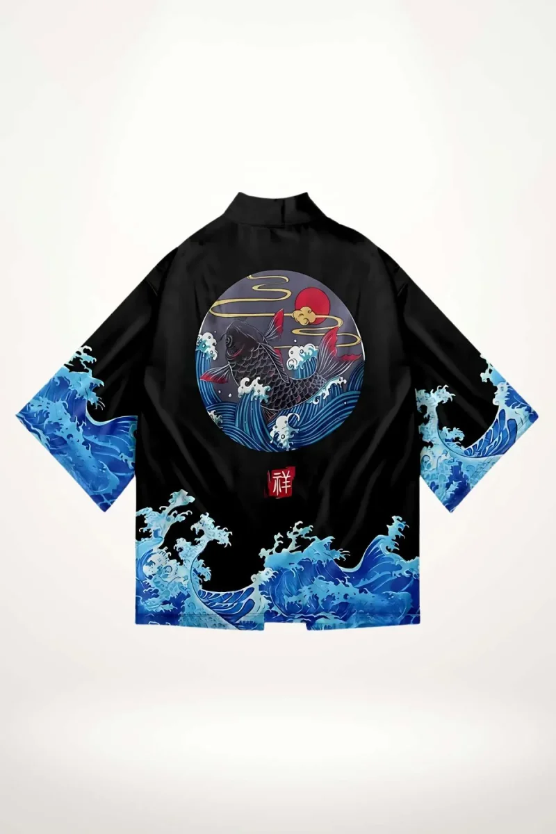 En bref : Cette veste kimono homme déploie une silhouette ample et fluide, portée par une coupe droite aux manches larges trois-quarts. Le noir profond du tissu contraste avec un motif aquatique saisissant, où des vagues bleues dynamiques s’élèvent sur les bas et les manches. Au dos, un cercle met en scène une carpe koi noire et rouge, symbolique et puissante, sur fond de soleil rouge et d’éléments dorés. Une pièce qui allie prestance et modernité dans un esprit japonais assumé.