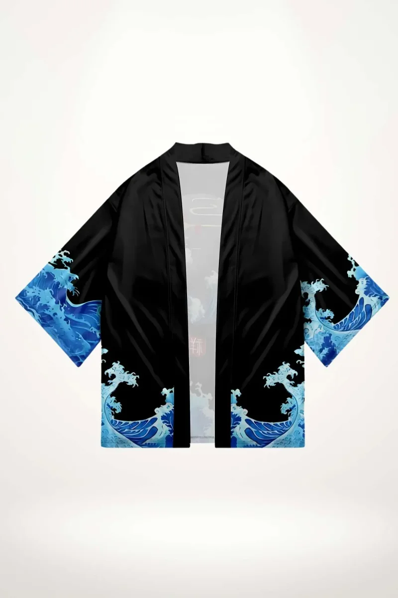 La coupe ample et droite de cette veste kimono homme apporte une aisance remarquable, tandis que ses manches larges trois-quarts rappellent la tradition japonaise avec une modernité affirmée. Le noir profond du tissu met en valeur les motifs bleus des vagues qui s’échappent du bas et des manches, apportant un dynamisme visuel fort.