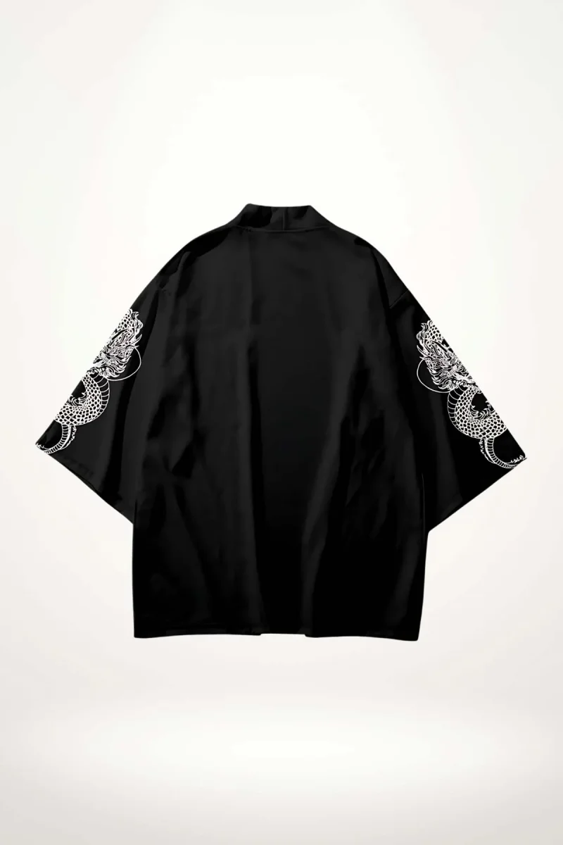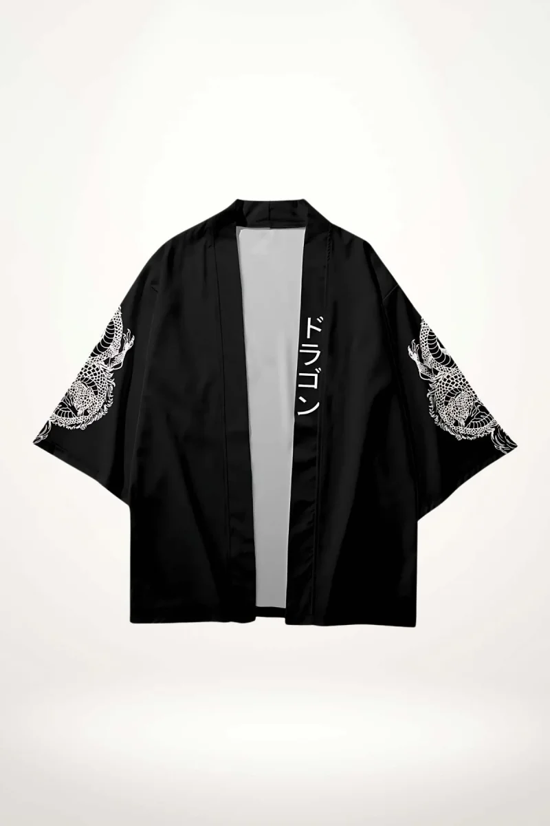 En bref : Cette veste style kimono homme s’impose par son noir profond et ses manches larges ornées d’un dragon blanc finement dessiné. Une inscription japonaise verticale vient souligner l’ouverture frontale, ajoutant une touche d’authenticité contemporaine. La coupe ample et droite offre une silhouette décontractée avec une prestance naturelle, tandis que le polyester léger apporte une fluidité agréable au porté.
