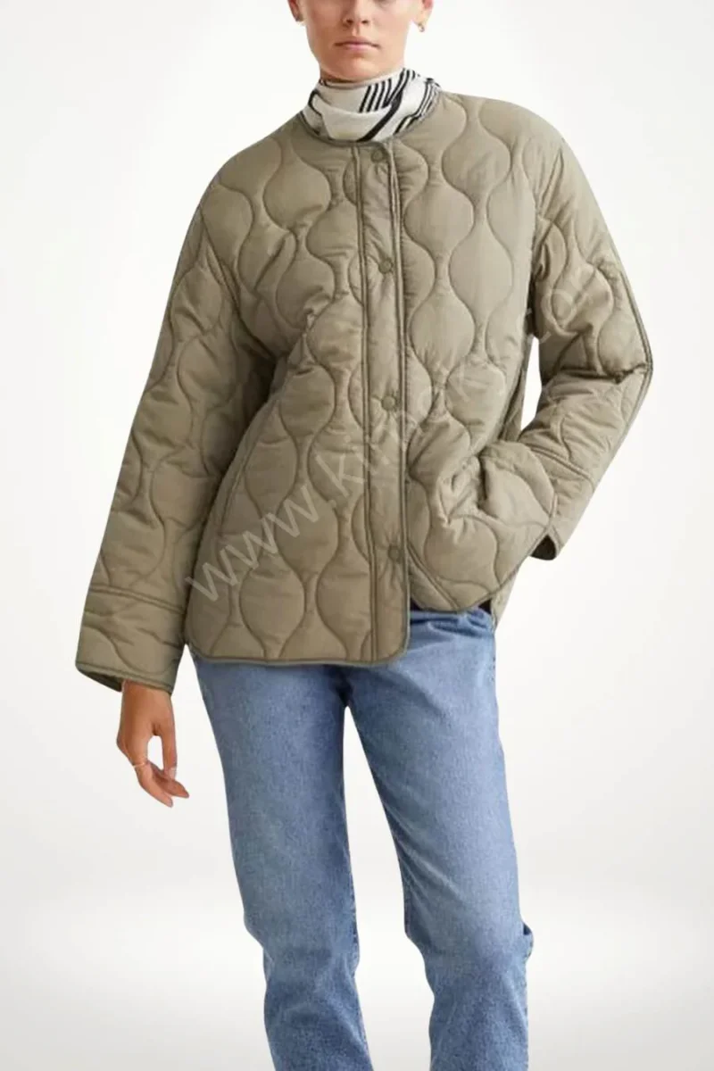 En bref : Cette veste kimono femme hiver dévoile une silhouette contemporaine et épurée. Sa coupe droite, légèrement ample, se pare d’un matelassage ondulé qui rythme la surface avec délicatesse. Le col rond sans revers et les manches longues aux poignets simples renforcent son allure minimaliste. Son coloris kaki doux s’harmonise avec sobriété à un jean bleu délavé, tandis que les pressions frontales permet une fermeture discrète et pratique.