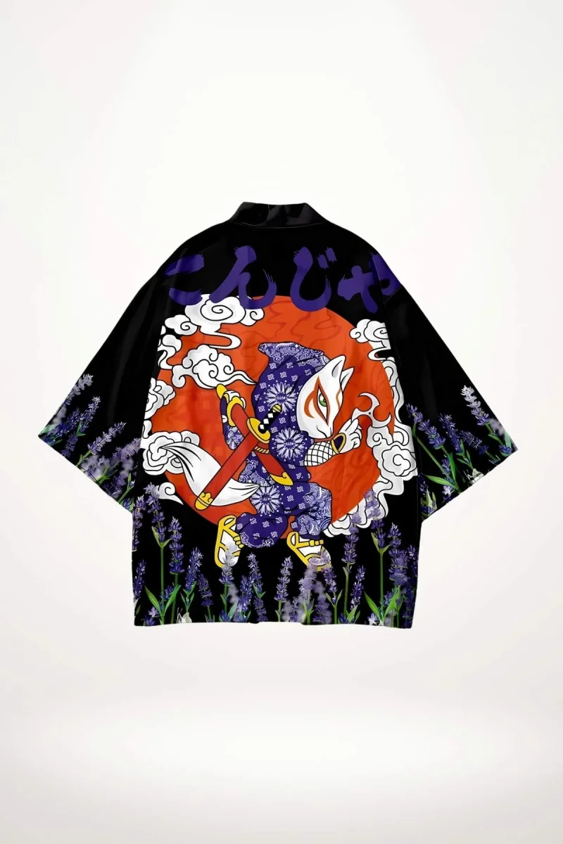 Le graphisme central, mêlant un renard masqué en kimono traditionnel et un sabre, raconte une histoire visuelle forte, renforcée par le contraste du cercle rouge et des nuages blancs. Cette veste kimono se distingue par son audace et son raffinement subtil, grâce à la bordure florale de lavandes qui habille les manches et le bas de la pièce.