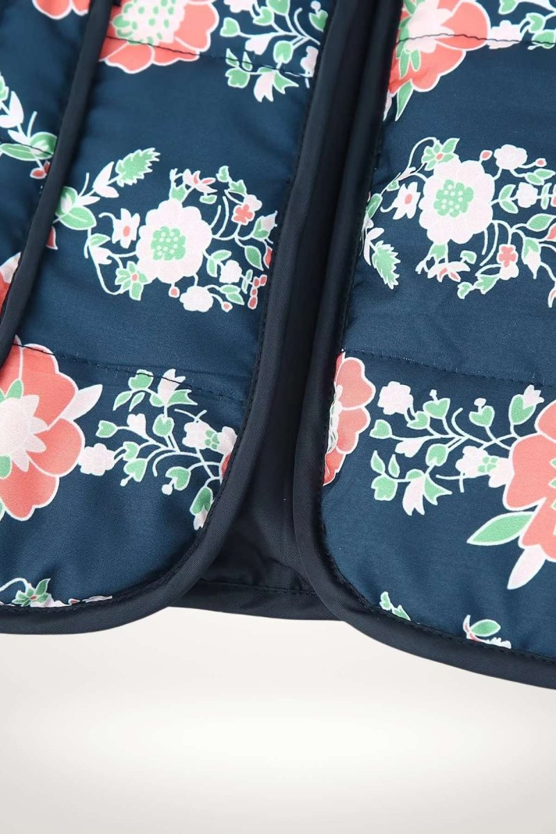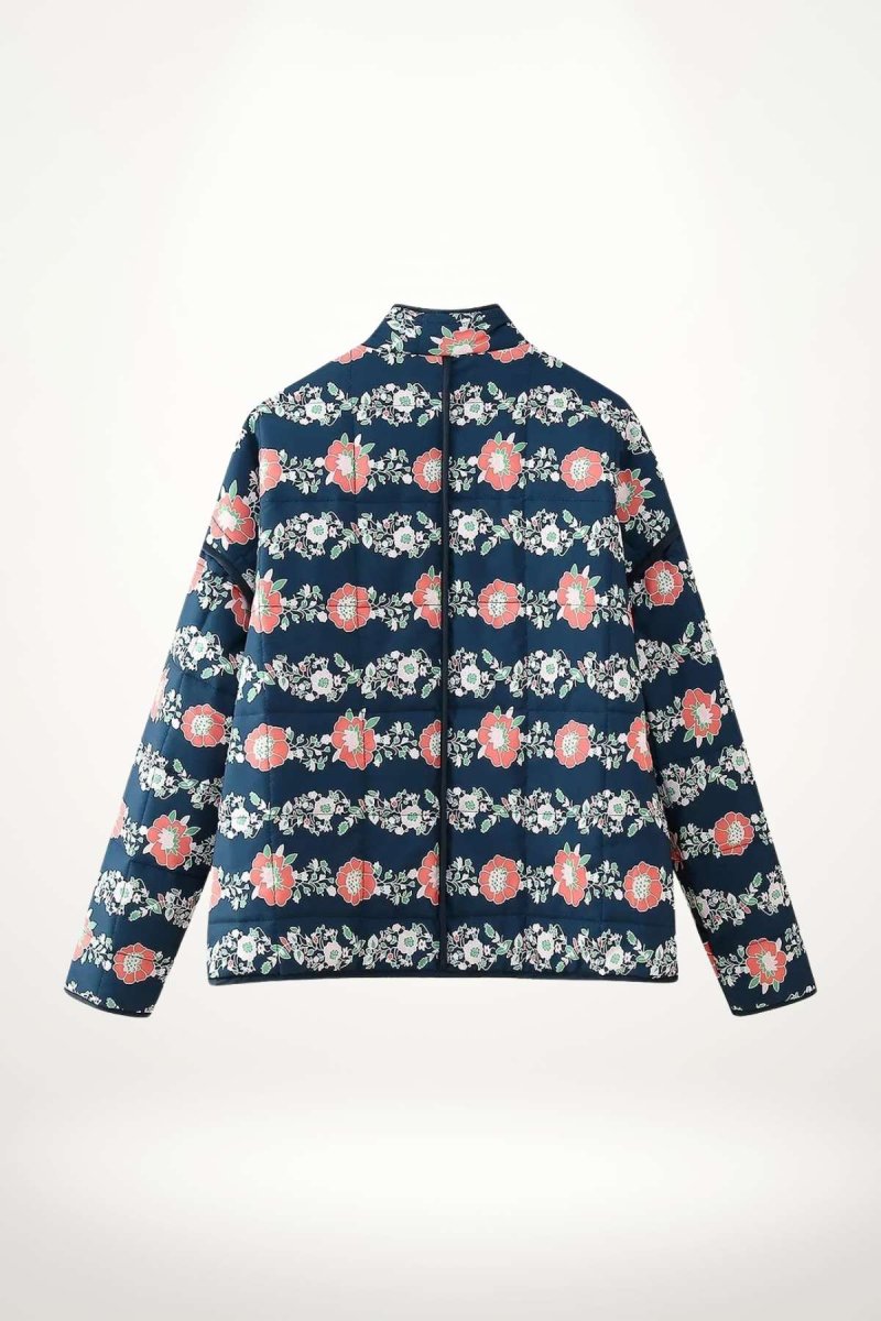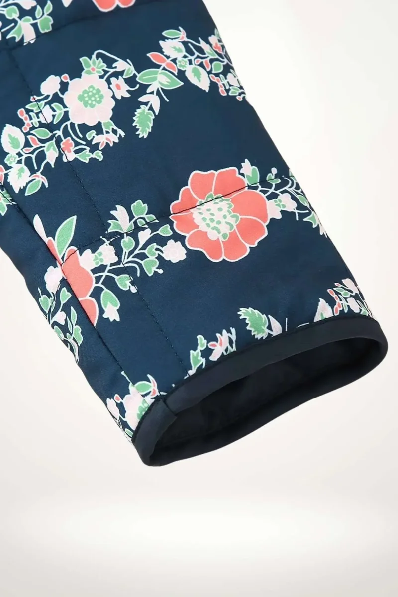 Le charme de cette veste matelassée kimono femme réside dans son imprimé floral raffiné, qui mêle harmonieusement des fleurs corail et des feuillages verts sur un fond bleu profond. Le matelassage horizontal ajoute du volume tout en conservant une silhouette fluide et légère.