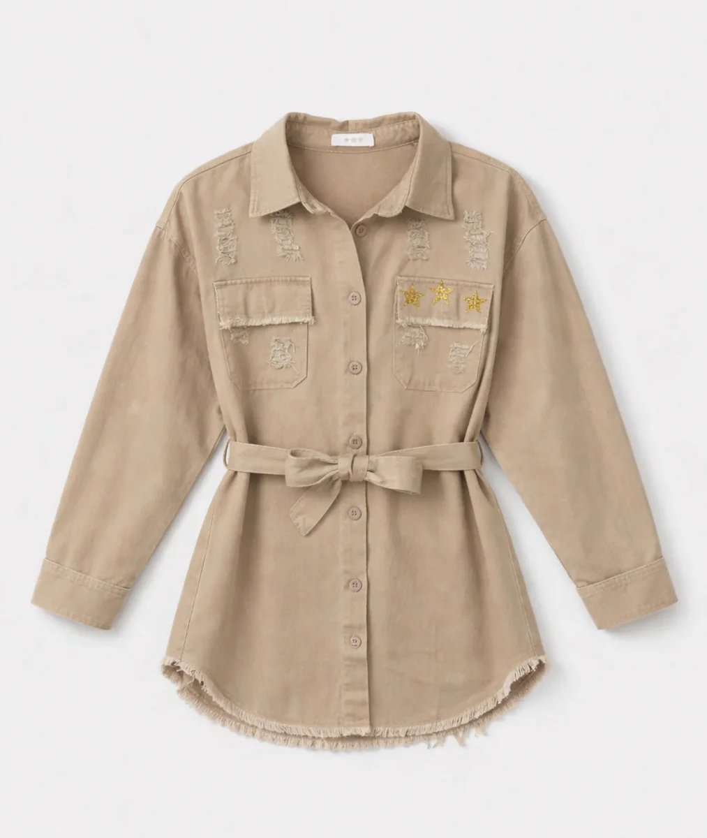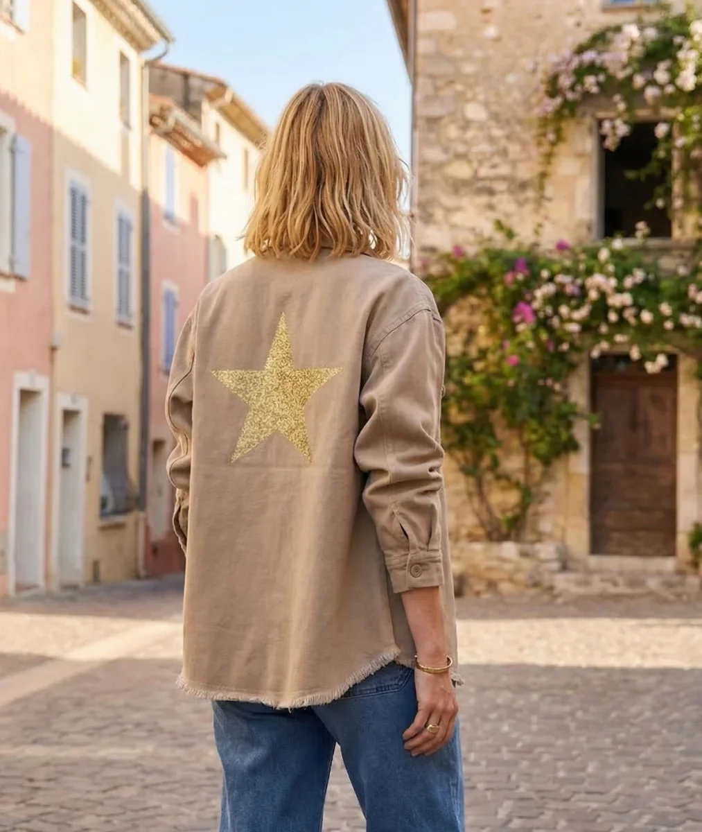 La veste en jean Niagara est un incontournable du vestiaire féminin pour la collection Printemps / Été. Confectionnée dans un denim beige, elle apporte une touche lumineuse et naturelle à toutes les tenues. Cette veste en jean femme se distingue par ses finitions soignées : col chemise, poches à rabats poitrine avec détails étoiles pailletées et fermeture boutonnée.