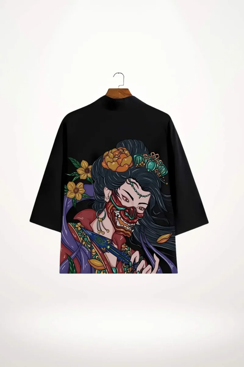 En bref : Cette veste kimono courte noire se distingue par son imprimé audacieux au dos, représentant une figure féminine stylisée avec un masque rouge et des ornements floraux. La coupe ample et fluide, les manches larges trois-quarts et la longueur qui s’arrête au-dessus des cuisses offrent une silhouette moderne et décontractée. Le tissu léger en polyester apporte un confort respirant et un tombé élégant, très agréable pour une veste style kimono femme facile à porter au quotidien.