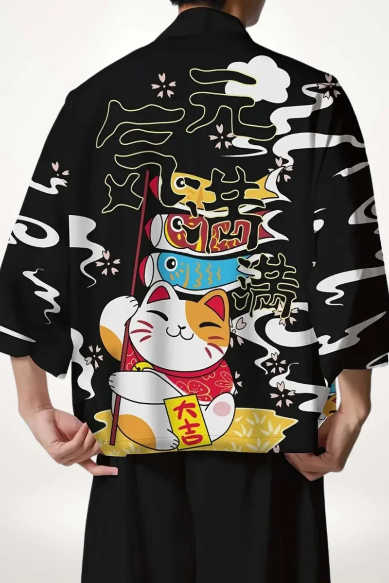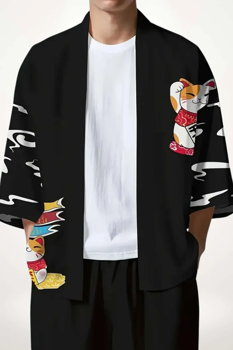 En bref : Cette chemise kimono pour homme déploie un univers ludique et coloré, où le chat porte-bonheur s’impose sur fond noir profond. Sa coupe ample et ses manches larges offrent une silhouette fluide, tandis que le tissu léger vise à un confort pensé pour la saison. Un équilibre subtil entre tradition japonaise et modernité urbaine.