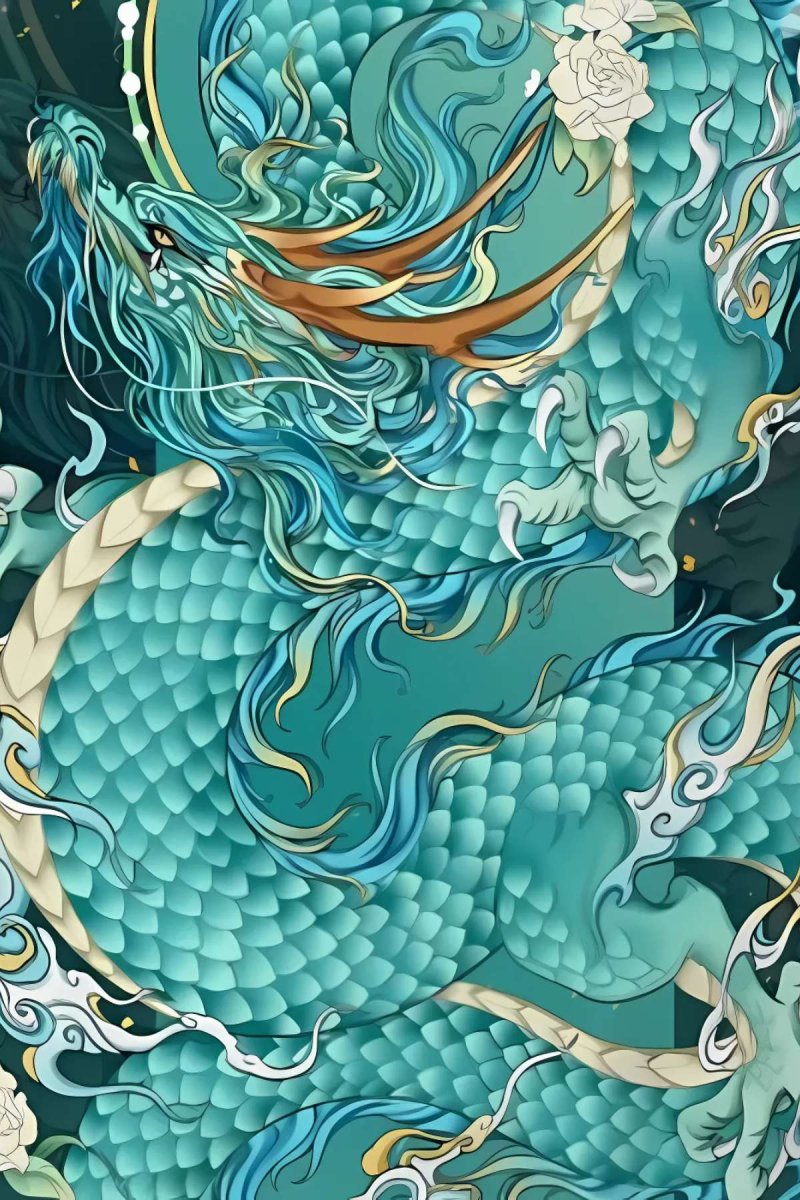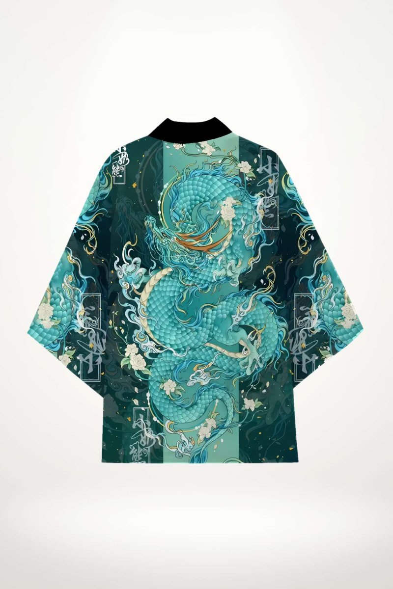 Le motif dragon, d’un bleu turquoise vibrant, s’anime sur toute la surface du kimono, mêlant écailles, volutes et fleurs blanches dans une composition harmonieuse. Ce jeu de couleurs profondes et lumineuses confère à ce kimono jacket homme une signature visuelle unique.