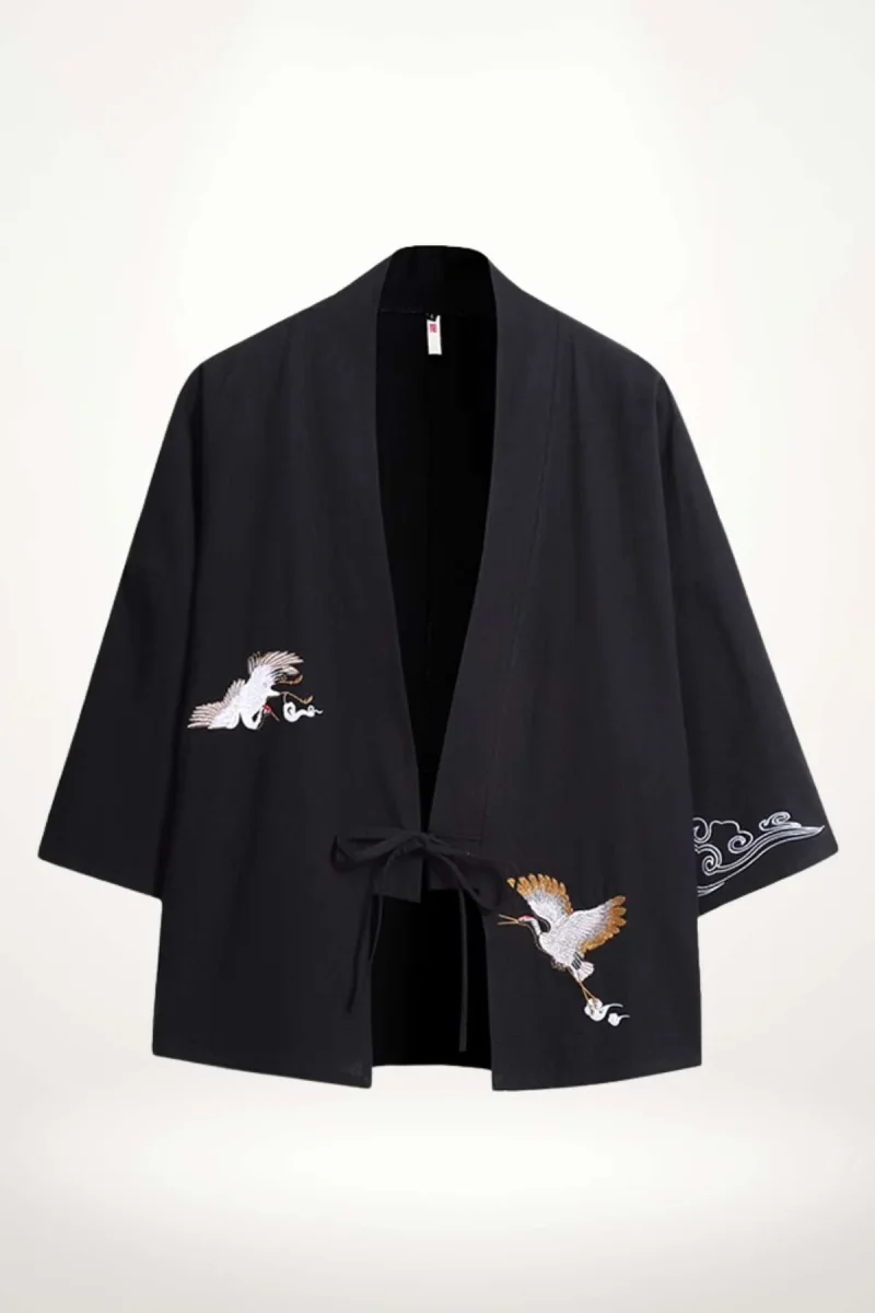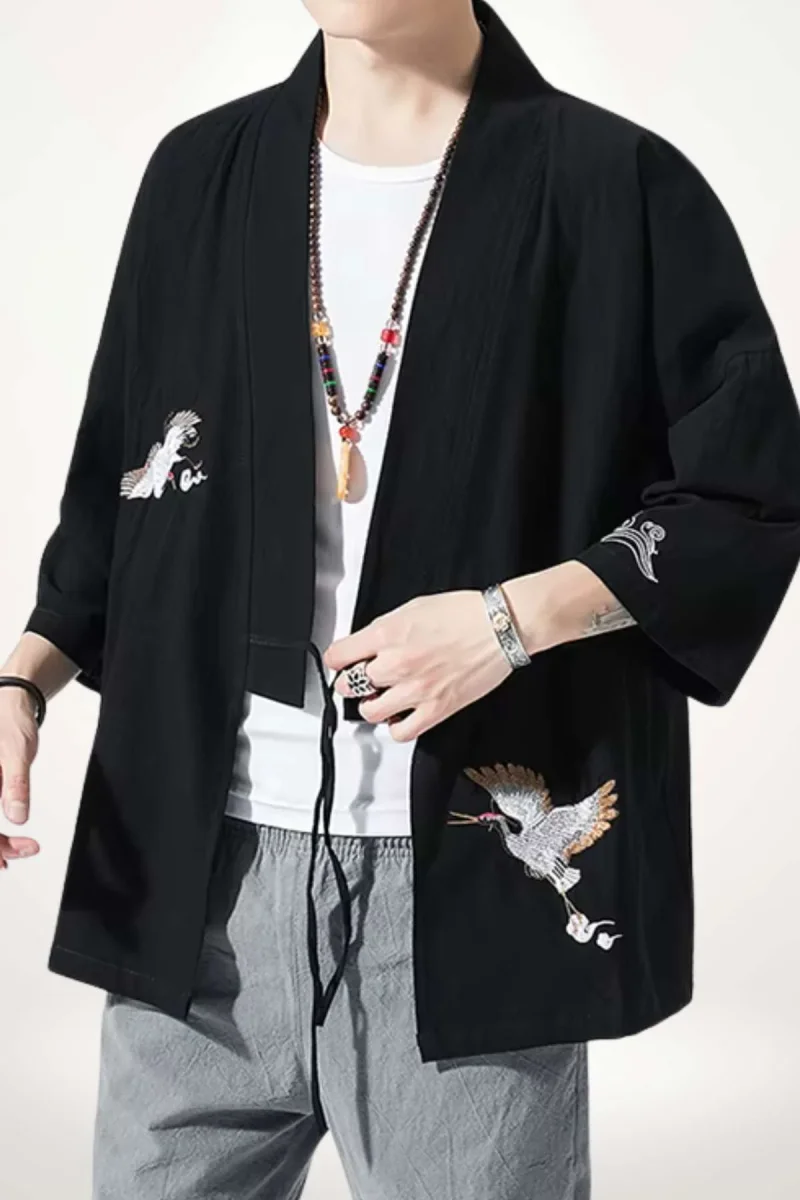 Le cardigan style kimono homme se distingue par ses manches amples tombant juste au-dessus du poignet, offrant une liberté de mouvement et une silhouette décontractée. Le col droit, sans revers, prolonge la simplicité élégante du modèle. La broderie de la grue, symbole de longévité et de noblesse, est finement réalisée en fils blancs et dorés, apportant une touche raffinée sur le noir profond du tissu.